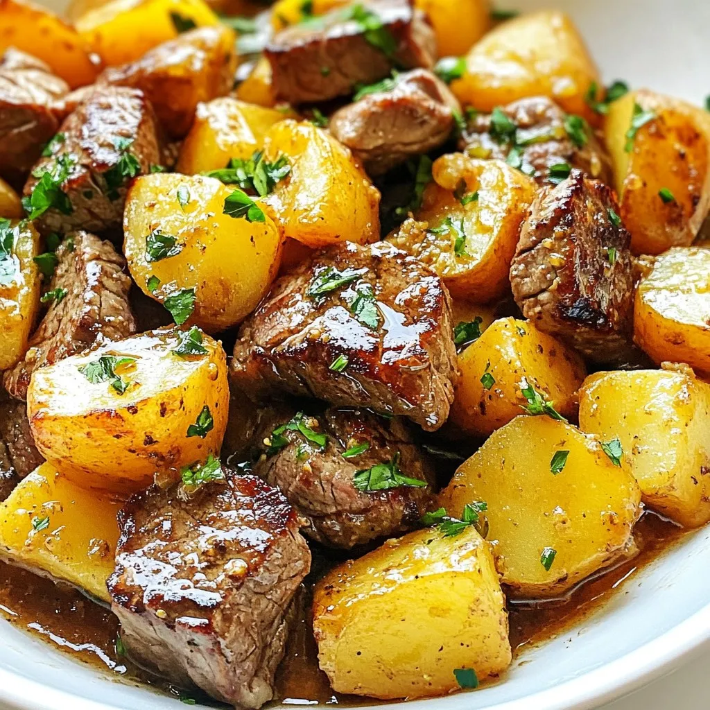 A delicious and hearty skillet dish featuring tender steak and crispy potatoes, all tossed in a rich garlic butter sauce.