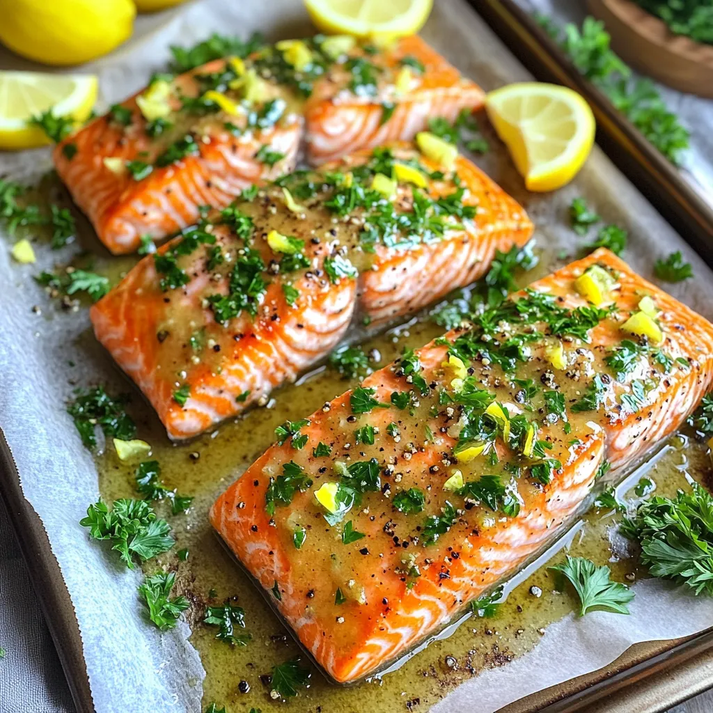 - 4 salmon fillets (about 6 oz each) - 4 tablespoons unsalted butter, melted - 4 cloves garlic, minced - 1 tablespoon fresh lemon juice - 1 teaspoon lemon zest - 1 teaspoon dried oregano - 1 teaspoon dried thyme - 1 teaspoon fresh parsley, chopped - Salt and pepper to taste The main ingredients for garlic herb butter roasted salmon are simple but full of flavor. You need fresh salmon fillets, which provide a rich taste and healthy fats. Garlic adds a strong and savory note to the dish. Unsalted butter brings creaminess and helps the herbs stick to the salmon. The herbs like oregano and thyme give a fresh and aromatic touch. The lemon juice and zest brighten the flavor, making it all come together. - Fresh lemon wedges - Additional herbs for decoration Garnishes can elevate your dish. Fresh lemon wedges add a zesty kick when you squeeze them over the salmon. Additional herbs can brighten up your plate, making it look more colorful and inviting. This small touch makes your meal feel special and adds a burst of flavor. 1. First, preheat your oven to 400°F (200°C). This step is key to getting a nice roast on the salmon. 2. Next, prepare your baking sheet. Line it with parchment paper. This makes clean-up easy and helps prevent sticking. 1. In a small bowl, mix your garlic herb butter. Combine 4 tablespoons of melted unsalted butter with 4 minced garlic cloves, 1 tablespoon of fresh lemon juice, 1 teaspoon of lemon zest, and the dried herbs: 1 teaspoon each of oregano and thyme, plus chopped parsley. Add salt and pepper to taste. Stir until smooth and well mixed. 2. Now, take your salmon fillets and place them skin-side down on the lined baking sheet. Use a brush to coat the salmon well with the garlic herb butter mixture. Make sure each fillet gets a generous amount. 1. Roast the salmon in your preheated oven for 12-15 minutes. The salmon should look opaque and flaky when done. 2. To check for doneness, use a fork. Gently flake a piece apart; if it separates easily, it’s ready. Let the salmon rest for a few minutes after cooking. This helps keep it juicy. Serve with lemon wedges for added flavor. Resting time is key. After cooking, let the salmon rest for 5 minutes. This gives the juices time to settle. If you skip this step, the salmon may dry out. To check if the salmon is done, use the flaking method. Take a fork and gently pull at the thickest part. If it flakes easily, it's ready to eat. If it resists, give it a few more minutes. To boost flavor, consider adding spices like paprika or cayenne pepper. These will add a nice kick. You can also mix in some fresh dill or basil for a new twist. For a crispy texture, place the salmon skin-side down on the baking sheet. This helps crisp up the skin while roasting. You can also broil the salmon for the last 2 minutes for extra crispiness. Pair the salmon with sides like roasted veggies or a fresh salad. Quinoa or rice also work well. These sides balance the rich flavor of the salmon. For a drink, choose a light white wine like Sauvignon Blanc. It complements the lemon and herbs nicely. If you prefer non-alcoholic, a sparkling water with lemon is refreshing too. {{image_2}} You can switch up the fish in this recipe easily. Try trout or cod if you want a change. Both have great flavor and cook well with garlic herb butter. This recipe is also perfect for those who prefer vegetarian options. You can use hearty vegetables like zucchini or eggplant. Slice them thick and roast them with the same herb butter. This gives you a dish that is just as tasty and satisfying. You have many ways to customize the flavor of your salmon. Adding different herbs can make a big difference. Fresh dill or basil works well with the garlic and butter. You can also try a mix of dried herbs for a unique taste. Want something extra? Use alternate sauces like teriyaki or a spicy sriracha glaze. These add heat and a fresh twist to your meal. Toppings like crushed nuts or breadcrumbs can add a nice crunch, making each bite exciting. - Refrigerator recommendations: Place any leftover salmon in an airtight container. It can stay fresh for up to three days. Make sure to cool it down first before sealing it up. This helps keep the texture nice. - Freezing guidelines: If you want to keep it longer, freeze the salmon. Wrap each piece tightly in plastic wrap and then put it in a freezer bag. It’s best if you eat it within three months. Just remember, thaw it in the fridge before reheating. - Best methods to retain flavor and texture: To reheat salmon, set your oven to 275°F (135°C). Place the salmon on a baking sheet and cover it with foil. Heat for about 15 minutes. This method keeps the salmon moist. You can also use the microwave, but be careful. Heat it in short bursts to avoid drying it out. Enjoy your tasty meal! How do I know when the salmon is done? You can tell the salmon is done when it flakes easily with a fork. Look for a light pink hue. If it's still dark and raw in the center, it needs more time. Usually, roasting takes about 12-15 minutes. Keep an eye on it to avoid overcooking. Can I use frozen salmon fillets? Yes, you can use frozen salmon fillets! Just thaw them completely before cooking. Place them in the fridge overnight or run them under cold water. Once thawed, treat them just like fresh fillets. Adjust the cooking time slightly if needed. Calories and serving size Each serving of Garlic Herb Butter Roasted Salmon is about 6 oz. It contains around 350 calories. This makes it a healthy choice for dinner while being very tasty. Health benefits of salmon Salmon is rich in omega-3 fatty acids. These support heart health and brain function. It also contains high-quality protein and essential vitamins. Eating salmon can help boost your mood and overall well-being. Can I use margarine instead of butter? You can use margarine instead of butter if you prefer. However, butter gives a richer flavor. If you want the best taste, stick with unsalted butter. What herbs