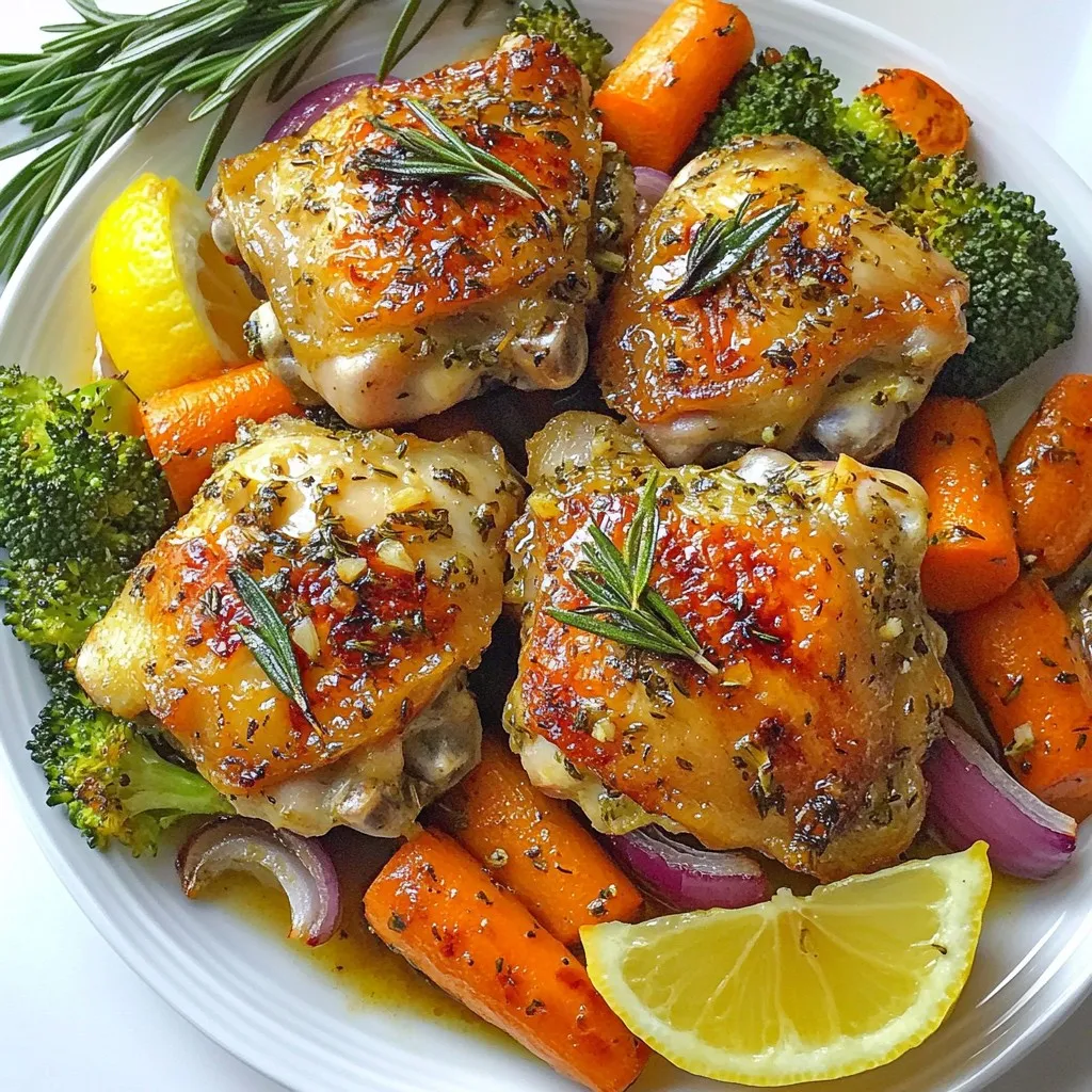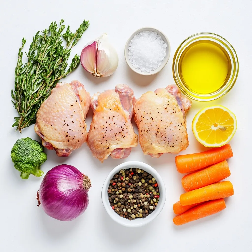 For this Garlic Herb Roasted Chicken & Veggies, you need fresh and simple items. The chicken thighs add rich flavor. The garlic brings warmth. Fresh rosemary and thyme give a nice herbal taste. Don’t forget the lemon; it brightens the dish.