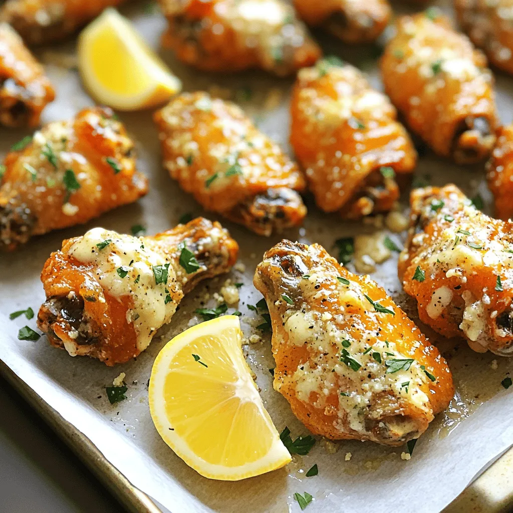 To make these tasty garlic Parmesan chicken wings, you need a few simple items. Here’s a list of what you’ll need: - 2 pounds chicken wings - 4 tablespoons unsalted butter, melted - 5 cloves garlic, minced - 1/2 cup grated Parmesan cheese - 1 tablespoon olive oil - 1 teaspoon garlic powder - 1 teaspoon onion powder - 1 tablespoon fresh parsley, chopped (plus extra for garnish) - Salt and pepper to taste - Optional: Lemon wedges for serving These ingredients come together to create a delicious flavor. The chicken wings are the star here. They soak up all the flavors from the garlic, butter, and Parmesan cheese. Using fresh garlic gives a strong taste, while the Parmesan adds a rich, nutty note. I love how the butter creates the perfect base for the sauce. It makes the wings shiny and helps the other flavors stick. The parsley adds a bright touch, making the dish look pretty too. If you want a pop of flavor, serve with lemon wedges. They add a zesty kick that pairs well with the wings. This recipe is simple, yet it offers a big flavor payoff. You can easily make these wings for game day or a cozy dinner at home. For the full recipe, check out the details above. First, set your oven to 425°F (220°C). This high heat helps the wings get crispy. While the oven warms up, line a large baking sheet with parchment paper. This step makes cleanup easy. In a large bowl, mix the chicken wings with olive oil, garlic powder, onion powder, salt, and pepper. Use your hands to coat every wing well. Make sure they are all covered in the seasonings. This will add great flavor. Spread the wings out in one layer on the baking sheet. Bake them for 35 to 40 minutes. Remember to flip them halfway through. This helps them cook evenly and get that golden brown look. While the wings bake, melt the butter in a small saucepan over medium heat. Add the minced garlic and cook it for 1 to 2 minutes. You want it to smell great but not brown. Once it smells good, take it off the heat. Stir in the Parmesan cheese and chopped parsley until well mixed. When the wings finish baking, take them out of the oven. Place them in a large bowl. Pour the garlic Parmesan sauce over the hot wings. Toss them gently to coat every wing in the sauce. This step is key for great flavor. Serve the wings hot. Add extra chopped parsley on top for a fresh touch. If you like, serve with lemon wedges for a zesty kick. These wings are perfect for any gathering or just a tasty treat. For the complete recipe, check the Full Recipe section. To get crispy wings, start with dry chicken. Pat them with paper towels. This helps remove extra moisture. Use a high oven temperature of 425°F (220°C). Bake them on a lined tray. Flip halfway through for even crisping. Using a wire rack can also help air flow around the wings. For a strong garlic taste, use fresh garlic cloves. Minced garlic gives a bold flavor. Cook it just enough to be fragrant, about 1-2 minutes. Don't let it brown, as that can make it bitter. Mixing garlic powder with fresh garlic adds depth. The sauce should coat the wings well. Melt the butter and mix it with garlic and cheese. If the sauce is too thick, add a bit more butter. If it’s too thin, add more cheese. You want a nice balance. This makes every bite flavorful and rich. For the full recipe, check out the details above. {{image_2}} Buffalo style wings add heat to the classic garlic Parmesan flavor. Start with the same recipe. After tossing the wings in the garlic Parmesan sauce, add a few dashes of hot sauce. You can use your favorite brand, like Frank's RedHot or Sriracha. This mix of spicy and savory creates a perfect balance that many love. For those who like extra heat, try a spicy rub. Mix cayenne pepper and smoked paprika into the olive oil. Coat the wings before baking. This will give your wings a nice kick before you add the garlic Parmesan sauce. You can adjust the spice level to match your taste. A little goes a long way! Using an air fryer makes crispy wings with less oil. First, season the wings as usual. Then, place them in the air fryer basket in a single layer. Cook at 400°F for about 25-30 minutes. Shake the basket halfway through to ensure even cooking. After they are crispy, toss them in the garlic Parmesan sauce from the Full Recipe. You’ll love the crunch! After you enjoy your Garlic Parmesan chicken wings, store any leftovers in an airtight container. This helps keep them fresh. Let the wings cool down before sealing them. They can last in the fridge for about three to four days. To reheat the wings, use an oven. Preheat it to 350°F (175°C). Place the wings on a baking sheet and heat for about 10-15 minutes. This method helps retain their crispiness. You can also use a microwave. Heat in short bursts of 30 seconds. Check often to avoid sogginess. If you want to save the wings for later, freezing is a great option. First, let the wings cool completely. Then, place them in a freezer-safe bag. Remove as much air as possible before sealing. These wings can last for about two to three months in the freezer. To enjoy, thaw them in the fridge overnight and reheat as mentioned before. For the full recipe, check out the Garlic Parmesan Chicken Wings section above. To get your wings extra crispy, use a wire rack. Place it on your baking sheet. This allows air to flow around the wings. You should also pat them dry with paper towels before seasoning. This helps remove moisture. Bake them at a high temperature, around 425°F (220°C). Flip them halfway through for even cooking. Yes, you can use frozen chicken wings. Just make sure to thaw them first. You can do this in the fridge overnight. If you are in a hurry, run them under cold water. Once thawed, follow the same steps in the Full Recipe. Cooking time may be a bit longer. These wings pair well with many sides. You might enjoy them with celery and carrot sticks. A cool ranch or blue cheese dip also works well. For a fun twist, serve them with garlic bread. You 