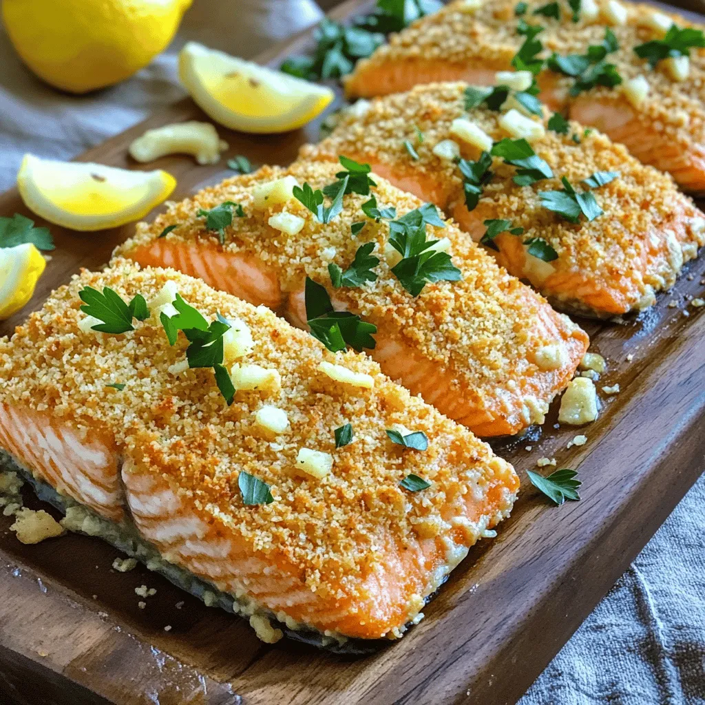 To start, gather all your ingredients. You need four salmon fillets, Parmesan cheese, breadcrumbs, garlic, parsley, lemon juice, olive oil, salt, and pepper. Preheat your oven to 400°F (200°C). This step ensures your salmon cooks evenly.