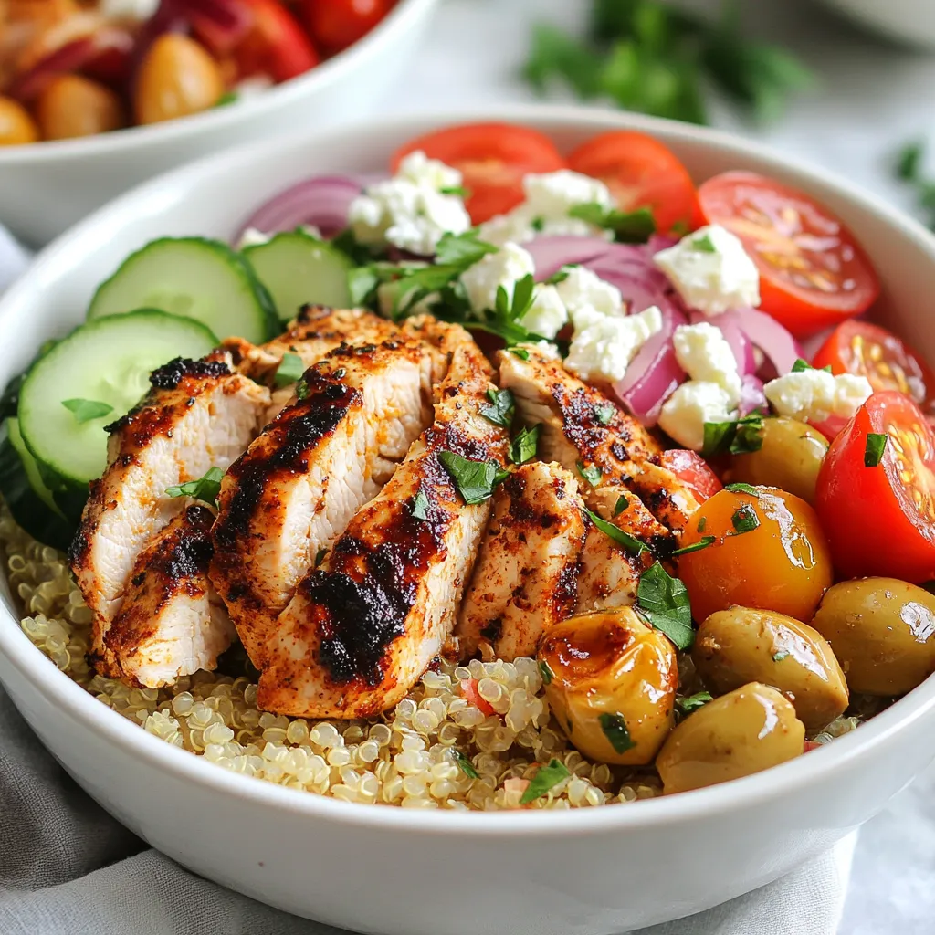 A delicious and healthy bowl featuring marinated grilled chicken, fresh vegetables, and quinoa or rice.