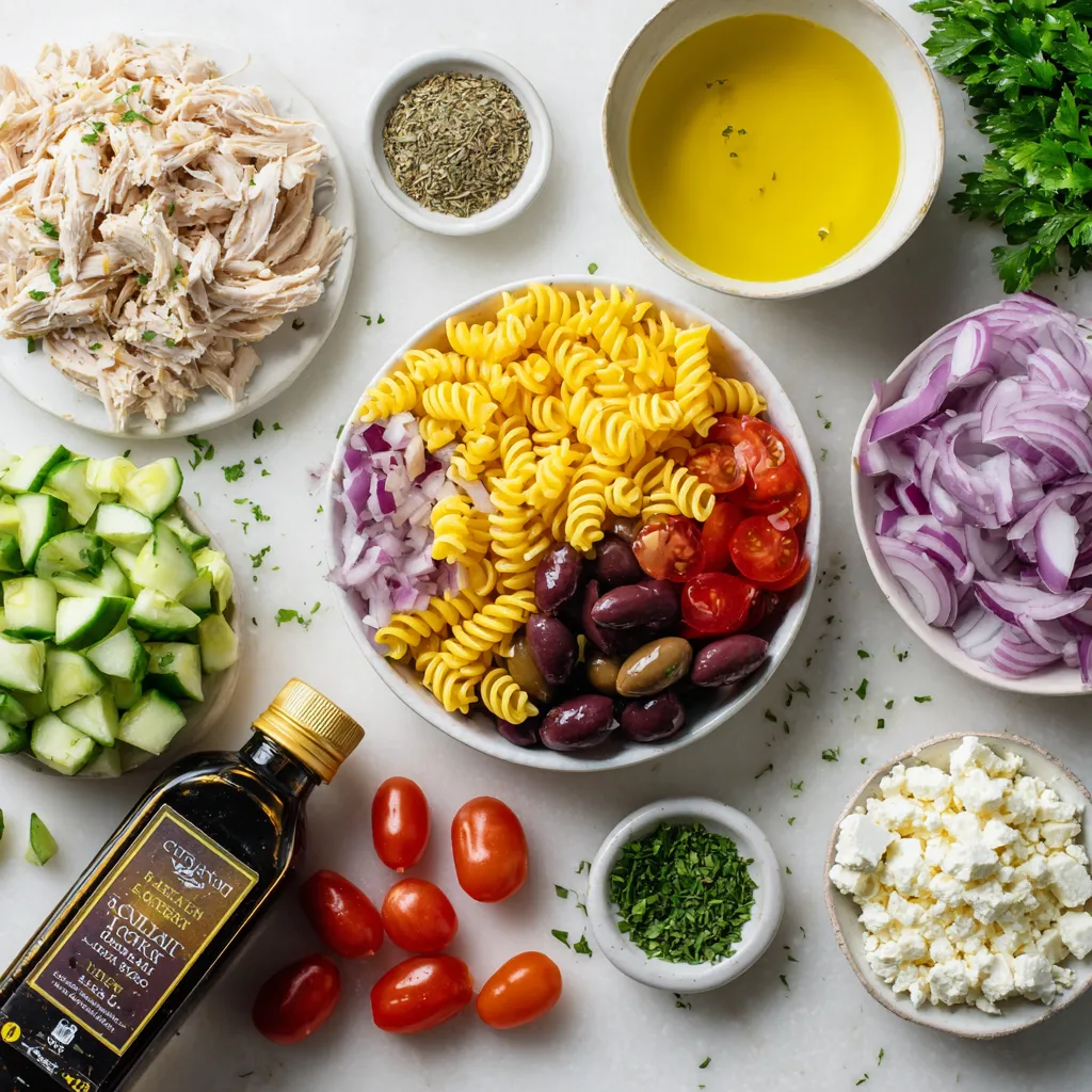 To make the Greek Chicken Pasta Salad, you need a few main items. Here’s what you should gather: