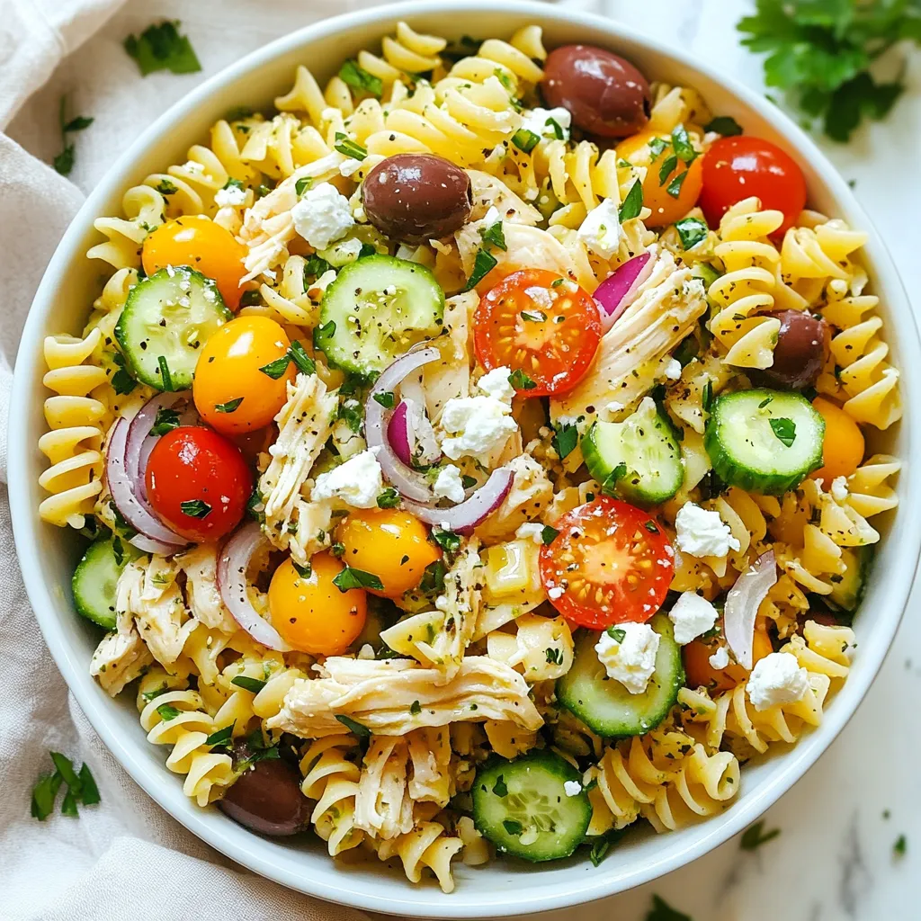 To make the Greek Chicken Pasta Salad, you need a few main items. Here’s what you should gather: - 2 cups rotini or fusilli pasta - 1 pound cooked chicken breast, shredded - 1 cup cherry tomatoes, halved - 1 cucumber, diced - 1/2 red onion, thinly sliced - 1 cup Kalamata olives, pitted and halved - 1 cup feta cheese, crumbled - 1/4 cup fresh parsley, chopped - 1/4 cup olive oil - 2 tablespoons red wine vinegar - 1 tablespoon dried oregano - Salt and pepper to taste These ingredients create a colorful and tasty dish. The pasta serves as a hearty base, while the chicken adds protein. Each veggie brings a crunch, and the olives and feta give it that classic Greek flavor. You can add some extra ingredients to boost the taste even more. Here are a few ideas: - Bell peppers, diced - Artichoke hearts, chopped - Spinach or arugula - Fresh lemon juice Adding these can bring new flavors and textures. For example, bell peppers add sweetness, while spinach gives it a fresh touch. If you can’t find some ingredients, don’t worry! Here are some swaps: - Use grilled turkey or tofu instead of chicken for a different protein. - Try different pasta shapes like penne or farfalle. - Swap Kalamata olives for green olives if you prefer a milder taste. - Use goat cheese instead of feta for a tangy kick. These substitutions keep the dish fresh and fun while catering to your taste preferences. {{ingredient_image_1}} Start with a large pot. Fill it with water and add salt. Bring the water to a boil. Add 2 cups of rotini or fusilli pasta. Cook it until it is al dente, following the package instructions. This usually takes about 8-10 minutes. Drain the pasta and rinse it under cold water. This stops the cooking and cools it down. In a small bowl, combine the dressing ingredients. Pour in 1/4 cup of olive oil and 2 tablespoons of red wine vinegar. Add 1 tablespoon of dried oregano. Season with salt and pepper to taste. Use a whisk to mix everything together until it is smooth and well combined. In a large mixing bowl, combine all the main ingredients. Add the cooked pasta first. Then, mix in 1 pound of shredded chicken breast, 1 cup of halved cherry tomatoes, 1 diced cucumber, and 1/2 thinly sliced red onion. Next, add 1 cup of pitted and halved Kalamata olives, and finish with 1 cup of crumbled feta cheese. Pour the dressing over the pasta mixture. Gently toss everything to coat well. The dressing should cover all the ingredients. For added freshness, sprinkle 1/4 cup of chopped parsley on top. Cover the bowl with plastic wrap and chill it for at least 30 minutes. This allows the flavors to mix. When ready to serve, give it another gentle toss. Serve in a large bowl and garnish with extra feta and parsley for a nice look. To make the best dressing, use fresh ingredients. Start with good olive oil. Combine it with red wine vinegar, oregano, salt, and pepper. Whisk them well in a small bowl. This helps mix the flavors fully. Taste it after mixing. Adjust salt or vinegar to your liking. A great dressing can lift the whole salad. Chill the salad for at least 30 minutes. This time allows the flavors to blend well. It also cools the pasta and chicken. If you can wait longer, do it! Letting it sit for two hours makes it even better. Serve it cold for a refreshing experience. Avoid overcooking the pasta. Cook it just until al dente. Rinse it in cold water right after. This stops the cooking. Don't add the dressing too early. If you dress it too soon, the pasta gets soggy. Lastly, don't skip the parsley garnish. It adds a fresh pop of flavor. Pro Tips Cook Pasta Al Dente: Cooking the pasta al dente will ensure that it holds its shape and texture when mixed with the dressing and other ingredients. Use Fresh Ingredients: For the best flavor, use fresh vegetables and herbs. The quality of the produce can significantly impact the overall taste of the salad. Chill Before Serving: Allowing the salad to chill for at least 30 minutes helps the flavors meld together, enhancing the overall taste of the dish. Customize Your Add-ins: Feel free to add other ingredients like bell peppers, artichokes, or even avocado to personalize the salad to your liking. {{image_2}} You can easily boost the veggie count in your Greek chicken pasta salad. Try adding bell peppers, spinach, or artichokes. These veggies add color and crunch. You can also use roasted vegetables for a smoky taste. Just make sure to chop them into bite-sized pieces. This way, they mix well with the pasta and chicken. If you want to switch up the protein, there are great options. You can use grilled shrimp or diced turkey instead of chicken. For a lighter option, try tuna or chickpeas. These proteins still work well with the Greek flavors. Just make sure they are cooked or canned and ready to go. You can make this salad vegetarian or vegan with a few changes. For a vegetarian dish, simply leave out the chicken and add more cheese. Feta cheese is a great choice here. If you want a vegan salad, use tofu or tempeh instead of chicken. You can also replace feta with a dairy-free cheese. This keeps the flavors fresh and tasty without any animal products. To keep your Greek Chicken Pasta Salad fresh, store it in an airtight container. This prevents air from getting in and helps maintain flavor. Make sure the salad is cool before sealing the container. It will stay fresh in the fridge for up to three days. If you see any liquid, drain it before serving. Crisp veggies like cucumbers and tomatoes add great flavor. To keep them fresh, store them separately. Place them in a small container or bag. When you are ready to eat, mix them in just before serving. This keeps them crunchy and bright. If you have leftover pasta salad, you can enjoy it cold or warmed up. To reheat, place it in a microwave-safe bowl. Heat it for 30 seconds, then stir. Check the temperature before eating. You want it warm, not hot. If it feels dry, add a splash of olive oil or vinegar to liven it up. You can stor