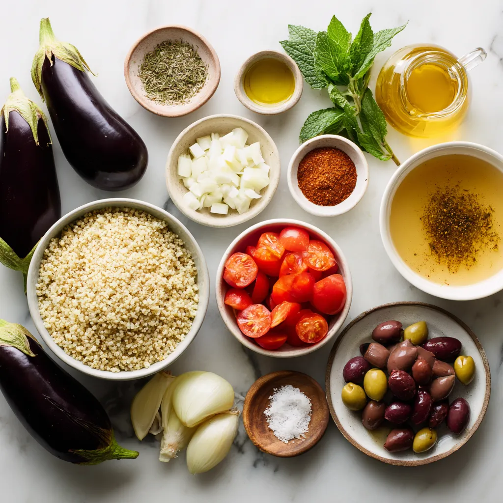 These main ingredients create a tasty blend. The eggplants serve as boats, holding the filling. Quinoa adds protein and texture. Cherry tomatoes bring sweetness, while onion and garlic add depth. Dried oregano and cumin offer a warm, savory taste. Kalamata olives add a briny kick, and feta cheese gives a creamy finish.