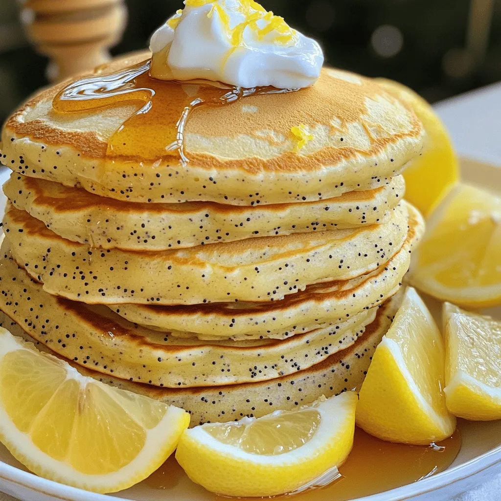 Serve these pancakes warm. Top them with extra Greek yogurt, fresh berries, or a drizzle of honey or maple syrup. For a beautiful look, stack the pancakes high. Sprinkle some extra poppy seeds and lemon zest on top. Add lemon wedges and a dollop of Greek yogurt for a refreshing touch.