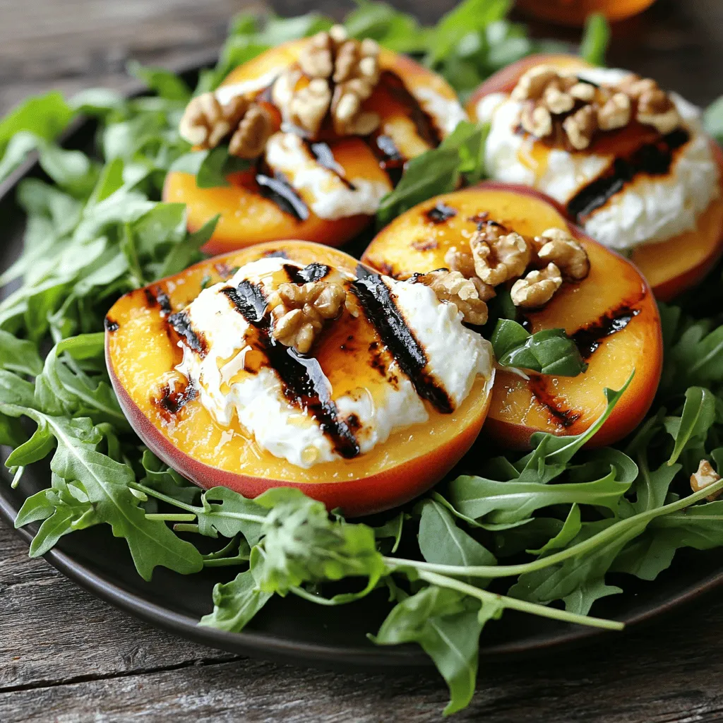 To make the grilled peach burrata salad, you will need: - 2 ripe peaches, halved and pitted - 1 tablespoon olive oil - Salt and pepper to taste - 4 cups arugula or mixed greens - 8 ounces burrata cheese - 1/4 cup walnuts, toasted - 2 tablespoons honey - 1 tablespoon balsamic glaze - Fresh basil leaves for garnish You can customize your salad with these options: - Substitute arugula with spinach or kale for a different taste. - Swap walnuts with pecans or almonds for a unique crunch. - Use feta cheese instead of burrata for a tangy flavor. - Add grilled chicken or shrimp for extra protein. Each serving of this salad has: - Calories: 320 - Protein: 10g - Fat: 25g - Carbohydrates: 16g - Fiber: 3g - Sugar: 10g For the full recipe, check out the Grilled Peach Burrata Salad section. To get started, you need ripe peaches. Choose peaches that yield slightly when you press them. This means they are sweet and juicy. First, cut the peaches in half and remove the pits. Next, brush each half with olive oil. Then, sprinkle a pinch of salt and pepper over them. This step adds flavor and helps create nice grill marks. Now, grab a large bowl. Add four cups of arugula or mixed greens as your base layer. Make sure the greens are fresh and crisp. They provide a nice contrast to the sweet peaches. Tear the grilled peaches into bite-sized pieces after grilling. Scatter them over the greens, making sure they are evenly distributed. Next, add generous portions of burrata cheese on top. Break it apart slightly for a creamy texture. Finally, sprinkle toasted walnuts over everything for a crunchy finish. Drizzle honey and balsamic glaze over the salad. This adds a sweet and tangy flavor. Make sure you cover all the ingredients for maximum taste. Finish with fresh basil leaves for extra aroma. Serve the salad on a large platter or on individual plates. This makes the dish look beautiful. For a special touch, add more basil leaves or an extra drizzle of honey if you like. For the full recipe, check out the details above. Grilling peaches brings out their sweet flavor. Here are some key tips: - Choose firm peaches: They hold up better on the grill. - Preheat your grill: Aim for medium heat to avoid burning. - Use oil before grilling: Brush the peach halves with olive oil. This helps prevent sticking. - Do not overcrowd the grill: Give each peach room to cook evenly. - Watch the time: Grill for 3-4 minutes or until char marks appear. Picking the right peaches is key to this dish. Here’s how: - Look for color: Peaches should have a deep yellow or golden hue. - Check for firmness: They should yield slightly to gentle pressure. - Smell the fruit: Ripe peaches have a sweet, fragrant aroma. - Avoid bruises: Inspect for any soft spots or blemishes. Burrata adds creaminess to your salad. To get it just right: - Let it sit at room temperature: About 30 minutes before serving. - Gently tear it apart: This creates a beautiful, creamy texture. - Serve fresh: Burrata is best enjoyed the same day for optimal flavor. These tips will help you create a stunning Grilled Peach Burrata Salad. For the complete instructions and ingredients, check the Full Recipe. {{image_2}} You can change the flavor with different dressings. A tangy vinaigrette can brighten the dish. Try mixing olive oil with lemon juice for a fresh twist. Another option is a creamy ranch dressing. This adds a rich taste that pairs well with burrata. You can also use a spicy honey mustard for a kick. Each dressing gives a unique flavor to the salad. Feel free to get creative with toppings. Add sliced prosciutto for a salty touch. Crumbled feta cheese can add a sharp flavor. You could also toss in some cherry tomatoes for color and taste. Fresh mint leaves can bring a refreshing note. If you want more crunch, consider adding crispy chickpeas. These toppings enhance the salad and make it your own. For a vegan option, skip the burrata cheese. You can use a nut-based cheese instead. Cashew cheese melts well and has a creamy texture. You could also try avocado slices for creaminess. For the dressing, use a plant-based alternative. Make sure to check for honey in your dressing, as it’s not vegan. These swaps keep the salad fresh and tasty without dairy. Explore the [Full Recipe](#) for detailed steps to create this delightful dish! To keep your grilled peach burrata salad fresh, store leftovers in an airtight container. Use a container that is just the right size. This helps prevent air from getting in. Place the salad in the fridge right after serving. Consume it within two days for the best taste. When storing the ingredients, keep them separate. Store the arugula and peaches apart from the burrata cheese. This will help maintain their textures. If you have extra walnuts, keep them in a cool, dry place. They can last longer that way. Reheating the salad is not ideal. The greens can wilt, and the burrata may lose its creamy texture. If you must, gently warm the salad in the microwave for 15 to 20 seconds. Avoid overheating, or you’ll lose the fresh flavors. For a delicious experience, serve this salad fresh or cold. For the full recipe, check out the Grilled Peach Burrata Salad . Yes, you can prepare some parts of this salad ahead. Grill the peaches and store them in the fridge. They will last for up to two days. You can also wash and dry the greens in advance. Just keep the burrata, walnuts, honey, and balsamic glaze separate until you serve. This way, the salad stays fresh and tasty. I love to serve this salad on a large platter. It looks great for gatherings. Place the arugula as the base layer. Then, add the grilled peaches and burrata on top. This makes a colorful display. You can drizzle honey and balsamic glaze right before serving. Garnish with fresh basil leaves for a nice touch. You can change the flavors to fit your taste. Try different nuts like pecans or almonds for crunch. You can also use mixed greens instead of arugula if you prefer. For a zesty kick, ad