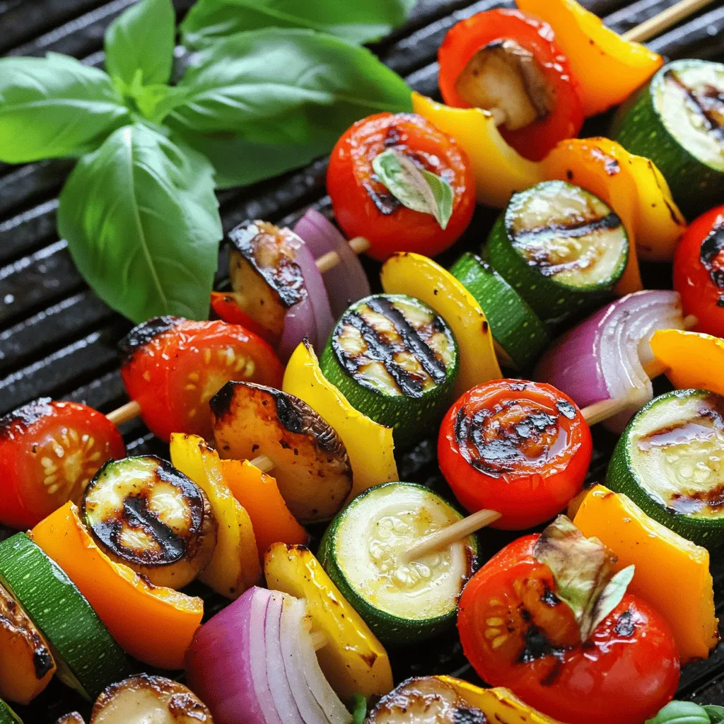 ![To make delicious grilled veggie skewers, you will need fresh vegetables, a tasty marinade, and some optional garnishes. Here’s what to gather for your Rainbow Grilled Veggie Skewers: - Vegetables for Skewers - 1 zucchini, sliced into thick rounds - 1 bell pepper (red, yellow, or orange), cut into 1-inch squares - 1 red onion, cut into wedges - 1 cup cherry tomatoes - 1 cup mushrooms, halved - Marinade Components - 2 tablespoons olive oil - 1 tablespoon balsamic vinegar - 1 teaspoon garlic powder - 1 teaspoon smoked paprika - Salt and pepper, to taste - Optional Garnishes - Fresh basil leaves for garnish These ingredients make a colorful and tasty dish. Each veggie adds its own flavor and texture. The marinade brings everything together and gives the skewers a nice kick. You can find the full recipe above to guide your cooking. Enjoy crafting these vibrant skewers! Prepping the Vegetables Start with fresh veggies. The colors and shapes make your skewers pop. I love using zucchini, bell peppers, red onion, cherry tomatoes, and mushrooms. Slice the zucchini into thick rounds. Cut the bell pepper into 1-inch squares. For the onion, cut it into wedges. Keep the cherry tomatoes whole and halve the mushrooms. This way, they all cook evenly. Soaking Wooden Skewers If you use wooden skewers, soak them in water for at least 30 minutes. This helps stop them from burning on the grill. It’s a simple step that makes a big difference. Making the Marinade In a large bowl, mix the vegetables. Then, in a small bowl, whisk together the marinade. Combine olive oil, balsamic vinegar, garlic powder, smoked paprika, salt, and pepper. Pour this over your veggies. Toss them to coat well. This will add a lot of flavor to your skewers. Grilling Tips for Optimal Flavor Get your grill hot! Preheat it to medium-high heat. This helps to sear the veggies quickly, locking in their juices. Place the skewers on the grill, making sure not to overcrowd them. Cooking Time and Temperature Grill the skewers for about 10-12 minutes. Make sure to turn them occasionally. You want the veggies tender with nice grill marks. The heat should be just right for cooking without burning. Achieving Perfect Grill Marks To get those beautiful grill marks, place the skewers on the grill and leave them for a few minutes before turning. This allows the grill to do its magic. Check them often, so they do not burn. The goal is to have a mix of char and tenderness. For the Full Recipe, check out the details above. Enjoy your delicious grilled veggie skewers! Choosing the Right Vegetables Pick fresh, colorful veggies for the best taste. Zucchini, bell peppers, and cherry tomatoes work great. They all cook well and add nice colors. Try to use a mix of textures, like crunchy bell peppers and soft mushrooms. This makes each bite interesting. Ensuring Even Cooking Cut your veggies into similar sizes. This helps them cook at the same rate. If you have large pieces, they may stay hard inside. If they are too small, they might burn. Aim for 1-inch pieces for best results. Marinating Tips for Enhanced Flavor Marinating adds depth to your skewers. Use olive oil, balsamic vinegar, garlic powder, and smoked paprika. Mix them well and let your veggies soak for at least 30 minutes. This helps the flavors blend. Overcrowding Skewers Don't cram too many veggies on one skewer. Leave some space between them. This allows heat to circulate and makes sure they cook evenly. Skewering Techniques When you skewer, alternate veggies for a colorful look. Start with a piece of a sturdy vegetable like onion, then add softer ones like mushrooms. This helps keep the skewer balanced. Avoiding Burnt Vegetables Keep an eye on the grill. Turn your skewers every few minutes. If they sit too long on one side, they can burn. Aim for a nice char, but watch for burning edges. {{image_2}} You can switch up the veggies based on what you like or what’s fresh. Use seasonal vegetables for the best flavor. In summer, try using eggplant or yellow squash. In fall, consider adding Brussels sprouts or butternut squash. Adding protein can make your skewers more filling. Try cubed chicken, shrimp, or tofu. Just make sure to cut the protein into similar sizes as the veggies. This way, everything cooks evenly. Herbs and spices can also change the taste of your skewers. Fresh herbs like thyme or rosemary give a nice touch. You can also use spices like cumin or coriander for a twist. These small changes can create a whole new dish! Global flavors can bring a new vibe to your grilled veggies. For Italian flair, use olive oil, garlic, and oregano. For a Mexican touch, add lime juice and chili powder. The world of flavors is wide and exciting! When it comes to marinades, you can choose between sweet and savory. A honey-soy sauce mix can add sweetness. On the other hand, a tangy vinegar-based marinade can enhance savory notes. You can always experiment to find your favorite mix. Adjust the spice level to suit your taste. If you like heat, add red pepper flakes or hot sauce. For a milder flavor, skip the spicy ingredients. Tailoring the spice level makes the dish perfect for everyone. For the full recipe, check out [Full Recipe]. Refrigeration Guidelines After grilling, let your veggie skewers cool. Place them in an airtight container. Store them in the fridge for up to 3 days. Make sure to keep them separate from any sauces. This helps keep their flavor fresh. Freezing Grilled Veggies You can freeze leftover skewers. Wrap them tightly in plastic wrap, then place them in a freezer bag. They will last for about 2 months in the freezer. When you’re ready to eat, thaw them in the fridge overnight. Best Methods for Reheating To reheat your veggie skewers, use an oven or a skillet. Preheat your oven to 350°F (175°C). Place the skewers on a baking sheet and heat for about 10 minutes. If using a skillet, add a little olive oil and warm them over medium heat. Ensuring Flavor Remains Intact When reheati