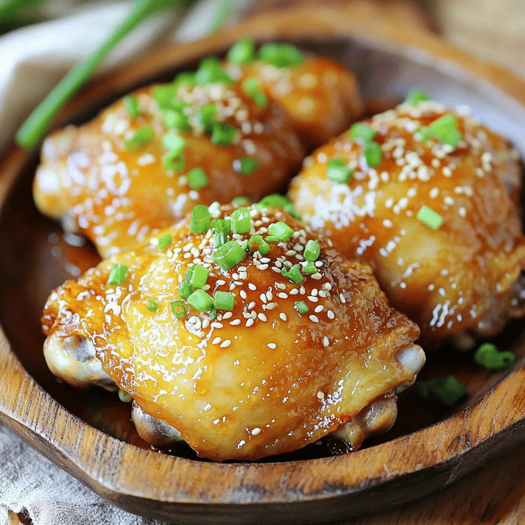 - Chicken thighs: 6 bone-in and skin-on - Marinade components: honey, garlic, soy sauce, apple cider vinegar, ground ginger, black pepper, olive oil - Garnishes: sesame seeds, chopped green onions For a delicious dinner, you need great ingredients. I recommend using bone-in, skin-on chicken thighs. They stay juicy and tender during cooking. The skin also crisps up nicely, giving you that perfect texture. Next, let’s talk about the marinade. This is where the magic happens. You’ll mix honey, garlic, soy sauce, apple cider vinegar, ground ginger, and black pepper. Each ingredient plays a role. Honey adds sweetness, while garlic brings a bold taste. Soy sauce adds umami, and vinegar gives a nice tang. Ginger spices it up, and black pepper adds a hint of heat. Finally, don’t forget the garnishes. Sesame seeds give a nutty crunch, and chopped green onions add a fresh touch. These simple elements make your dish look and taste amazing. For the full recipe, refer to the complete instructions. Enjoy your cooking! First, gather your ingredients. In a medium bowl, combine the following: - 1/3 cup honey - 4 cloves garlic, minced - 1/4 cup low-sodium soy sauce - 1 tablespoon apple cider vinegar - 1 teaspoon ground ginger - 1/2 teaspoon black pepper Whisk these together until you have a smooth mixture. This marinade gives the chicken its sweet and savory flavor. Now, let's marinate the chicken thighs. Place the chicken in a large resealable plastic bag or a shallow dish. Pour the marinade over the chicken. Seal the bag or cover the dish. For best results, let the chicken marinate in the fridge for at least 1 hour. If you have time, marinating overnight works wonders. For cooking, you can use two methods: searing and baking. Searing the chicken thighs: - Heat 2 tablespoons of olive oil in a large oven-safe skillet over medium-high heat. - Once hot, add the chicken thighs skin-side down. - Cook for about 4-5 minutes. You want the skin to be nice and golden brown. Baking instructions in the oven: - After searing, flip the chicken thighs over. - Pour the reserved marinade over the chicken. - Preheat your oven to 400°F (200°C) and place the skillet in the oven. - Bake for 25-30 minutes. The chicken should reach an internal temperature of 165°F (74°C). - After cooking, let the chicken rest for 5 minutes. You can garnish with sesame seeds and chopped green onions. This method ensures juicy, flavorful chicken every time! For the complete instructions, check the Full Recipe. To get that perfect crispy skin, start by patting the chicken dry. Use paper towels to remove extra moisture. This step is key for a nice crunch. Next, sear the chicken in a hot skillet. Heat olive oil over medium-high heat. Place the chicken skin-side down and cook for about 4-5 minutes. You want the skin to turn golden brown. This method locks in flavor and gives great texture. The best marinating time for chicken thighs is at least 1 hour. For deeper flavor, try marinating overnight. Just keep the chicken in the fridge. Make sure to coat all sides in the marinade. This will help the chicken soak up all the tasty flavors. Honey garlic chicken thighs pair well with several side dishes. Try serving them with steamed rice for a classic touch. Roasted vegetables also make a great match. You can add a fresh salad for balance. These sides enhance the meal and round out your dinner plate. Keep your meal colorful and delicious! For the full recipe, check out the complete instructions and tips. {{image_2}} You can boost the flavor of honey garlic chicken thighs with spices and herbs. Try adding a pinch of chili flakes for heat or some fresh thyme for a fragrant touch. You can also experiment with smoked paprika, which gives a nice depth to the dish. These small changes can transform your meal and make it unique. You can cook honey garlic chicken thighs in different ways. Grilling adds a smoky flavor and a nice char. Just marinate the chicken as usual, then place it on a hot grill for about 6-7 minutes per side. Baking, on the other hand, keeps the chicken juicy and tender. The method you choose can change the dish's taste and texture, so feel free to mix it up. If you want a gluten-free version, swap soy sauce for tamari. For a low-carb option, you can use a sugar substitute in place of honey. These changes make it easier to enjoy this dish while sticking to your dietary needs. Don't hesitate to get creative with your substitutions; your taste buds will thank you! For the full recipe, check out the details above. To store leftover chicken thighs, let them cool down first. Place them in an airtight container. Be sure to cover them well. Store the container in the fridge. Leftovers should be eaten within 3 to 4 days for best taste. To reheat chicken thighs, use an oven or stovetop. Preheat your oven to 350°F (175°C). Place the chicken on a baking sheet. Cover it with foil to keep it moist. Heat for 15-20 minutes or until warmed through. On the stovetop, heat a skillet over medium heat. Add a little oil and warm the chicken for 5-7 minutes, turning to avoid burning. This method keeps the flavor rich. If you want to freeze chicken thighs, wrap them tightly. Use plastic wrap or aluminum foil. Place them in a freezer-safe bag. Squeeze out the air before sealing. They can last up to 3 months in the freezer. To thaw, move the bag to the fridge overnight. Never refreeze thawed chicken. Enjoy your flavorful honey garlic chicken thighs later when you need a quick meal! For the full recipe, check out the previous section! The best way to marinate chicken thighs is simple and fun. Start with a bowl. Whisk together honey, minced garlic, soy sauce, apple cider vinegar, ground ginger, and black pepper. This blend gives great flavor. Pour the marinade over the chicken in a resealable bag or dish. Seal it tight. Let the chicken sit in the fridge for at least one hour. If you can wait longer, overnight is best. This allows the flavors to soak in deeply.