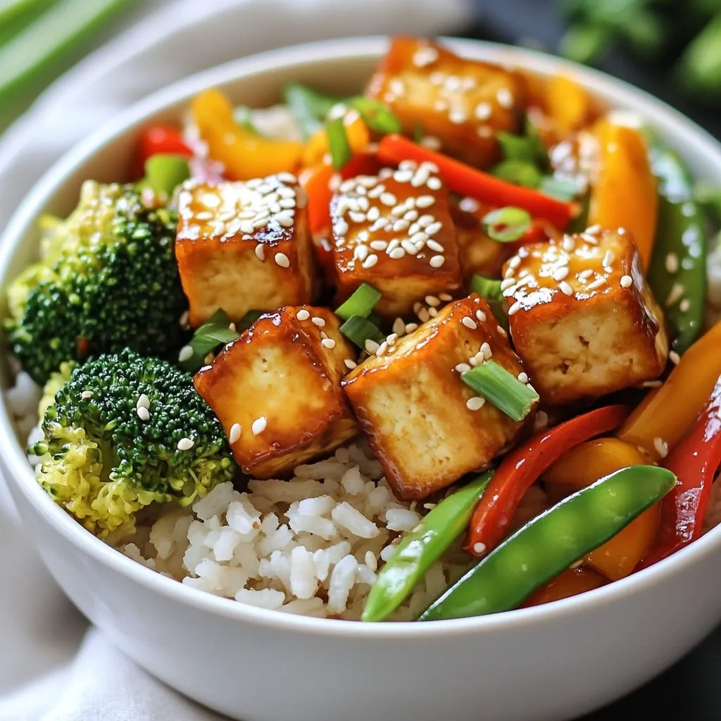 A delicious and healthy bowl featuring crispy tofu, mixed vegetables, and a sweet and savory sauce.
