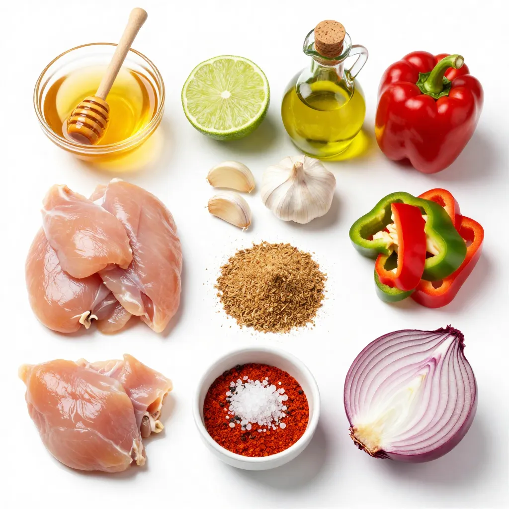 Delicious grilled chicken skewers marinated in a sweet and tangy honey lime sauce, paired with colorful vegetables.