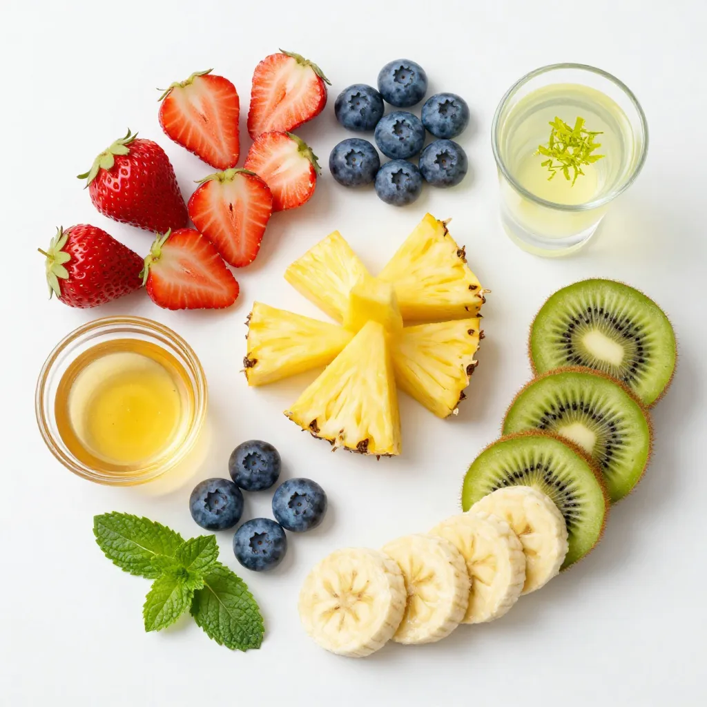 First, gather all your fresh fruit. You will need strawberries, blueberries, pineapple, kiwi, and banana. Start by hulling and slicing the strawberries. Next, wash the blueberries and dice the pineapple into small pieces. Peel the kiwi and cut it into slices. Finally, slice the banana. Place all the fruit into a large mixing bowl.