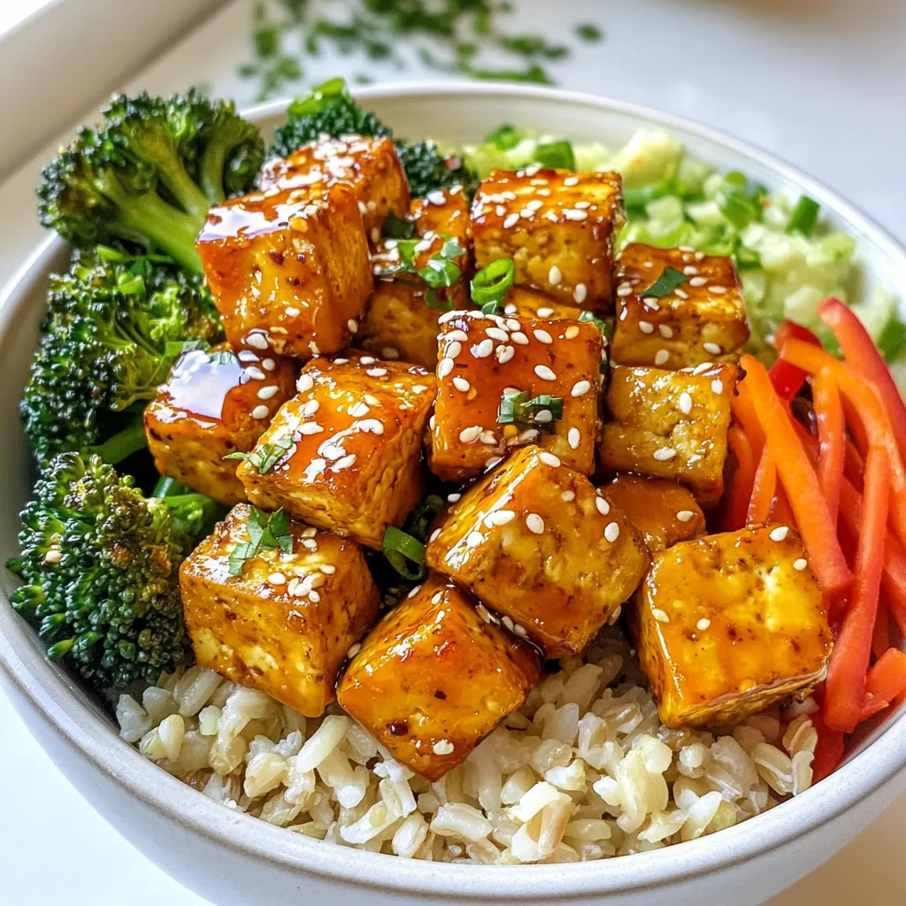 A delicious and spicy tofu bowl with honey and Sriracha, served over brown rice or quinoa with fresh vegetables.