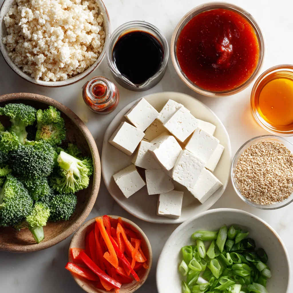 Cooked brown rice or quinoa forms the base of your bowl. Broccoli adds crunch, bell pepper brings color, and carrots add natural sweetness. Green onions give a fresh kick.