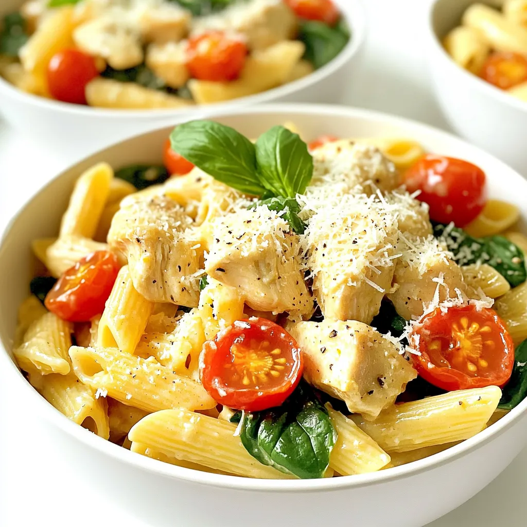 - 1 lb boneless, skinless chicken breasts - 8 oz penne pasta - 1 cup heavy cream - 1 cup cherry tomatoes, halved - 2 cups fresh spinach - 1/2 cup grated Parmesan cheese - 1 tablespoon olive oil - 3 cloves garlic, minced - 1 teaspoon Italian seasoning - 1 teaspoon red pepper flakes - 2 cups chicken broth - Salt and pepper to taste Gathering these ingredients sets you up for success. The chicken gives protein, while penne pasta makes it fill you up. Heavy cream adds richness, and cherry tomatoes bring a burst of flavor. Fresh spinach adds color and nutrition, and Parmesan cheese ties it all together. For seasoning, olive oil helps cook the chicken, while garlic adds a punch. Italian seasoning gives it that classic taste, and red pepper flakes can add some heat. Chicken broth is key for cooking the pasta, and salt and pepper enhance all the flavors. Make sure to get the freshest ingredients. This choice not only boosts taste but also makes your meal more nutritious. Enjoy the cooking process, as it leads to a creamy, delicious dish. First, I turn on the Instant Pot to the sauté function. I add a tablespoon of olive oil and let it heat for about a minute. Then, I toss in one pound of boneless, skinless chicken breasts, cut into bite-sized pieces. I season the chicken with salt, pepper, one teaspoon of Italian seasoning, and one teaspoon of red pepper flakes. I sauté the chicken until it turns lightly brown, which takes about four to five minutes. After that, I stir in three minced garlic cloves and cook for one more minute until I can smell the garlic. Next, I pour in two cups of chicken broth. I make sure the broth covers the chicken. Then, I add eight ounces of penne pasta, ensuring it is fully submerged in the liquid. This step is key for even cooking. Once everything is in, I close the lid of the Instant Pot, set the valve to sealing, and cook on high pressure for eight minutes. After the cooking time ends, I carefully perform a quick release to let the steam escape. I open the lid and stir the pasta and chicken to mix everything well. Then, I add one cup of heavy cream, one cup of halved cherry tomatoes, and two cups of fresh spinach. I stir these ingredients together until they blend nicely. I turn the Instant Pot back to sauté mode and let the mixture cook for three to four minutes. This lets the spinach wilt and warms everything up. Finally, I stir in half a cup of grated Parmesan cheese until it melts and makes the dish creamy. I taste it and adjust the seasoning as needed. To make your dish shine, start with the right seasonings. Adjust salt and pepper based on your taste. If you like more heat, add more red pepper flakes. Taste as you go to ensure balance. Next, let’s talk creaminess. Use heavy cream for that rich texture. If you want a lighter option, consider half-and-half. Just remember, the cream should meld well with the other flavors. Stir it in slowly and see how it blends. Serving your pasta nicely makes a big difference. Use deep bowls to hold the creamy sauce. Top each serving with extra grated Parmesan. This adds a lovely touch of flavor and elegance. Fresh basil leaves are a perfect garnish. They add color and a fresh aroma. You can also sprinkle some extra red pepper flakes for a pop of color. If you want to impress, consider serving with crusty garlic bread on the side. It’s a great way to soak up that creamy goodness! {{image_2}} - Alternatives for chicken: You can swap chicken for shrimp, tofu, or turkey. Shrimp cooks quickly and adds a nice flavor. Tofu is a great choice for a plant-based meal. Turkey provides a leaner option with a hearty taste. - Gluten-free pasta options: If you need gluten-free pasta, use rice or quinoa pasta. These options work well in this creamy dish. They absorb flavors nicely and keep the meal satisfying. - Adding different veggies: You can mix in bell peppers, zucchini, or mushrooms. These veggies add color and nutrition. They also bring new textures and tastes to the pasta. Adding them during the sauté step helps them cook well. - Using different cheeses: Try using goat cheese or mozzarella instead of Parmesan. Goat cheese adds a tangy flavor, while mozzarella creates a creamy texture. You can also mix different cheeses for a unique twist. To keep your creamy Tuscan chicken pasta fresh, store it in an airtight container. This helps maintain its flavor and texture. Place it in the fridge within two hours of cooking. This dish lasts about three to four days in the refrigerator. If you want to keep it longer, consider freezing it. It can stay good in the freezer for up to three months. Just remember to thaw it in the fridge before reheating. When reheating, I recommend using a stovetop method. This helps keep the creaminess intact. Start by adding a splash of chicken broth or cream to the pasta. Then, heat it over low heat. Stir it often to prevent sticking. You can also microwave it, but be cautious. Heat it in short bursts, stirring in between. For serving, add a sprinkle of fresh Parmesan and a few basil leaves. This adds a nice touch and enhances the flavor. Enjoy your delicious reheated creamy Tuscan chicken pasta just like it was fresh! To make this dish dairy-free, you can use alternative creams and cheeses. Here are some options: - Coconut cream: This thick cream adds richness. - Cashew cream: Blend soaked cashews with water for a creamy texture. - Nutritional yeast: This gives a cheesy flavor without dairy. - Dairy-free cheese: Many brands offer great dairy-free cheese options. These swaps keep the dish creamy and tasty without dairy. Yes, you can prepare this dish on the stovetop. Here’s how: 1. Sauté the chicken in a large pot with olive oil, salt, and pepper. 2. Add garlic after the chicken is browned. 3. Pour in chicken broth and add penne pasta. 4. Cover and simmer until the pasta is cooked, stirring occasionally. 5. Stir in cream, tomatoes, and spinach, cooking until heated through. This method takes a bit longer 