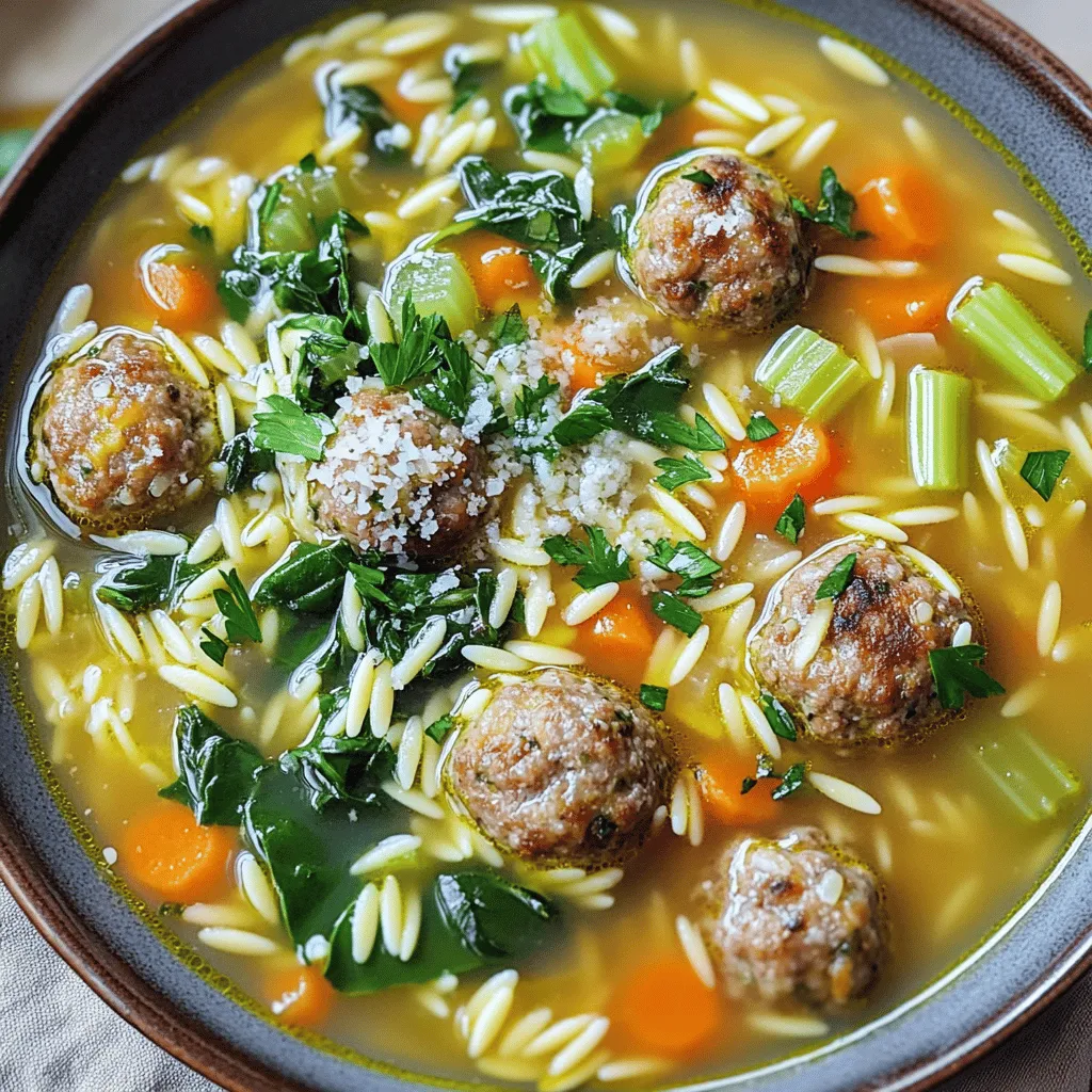 Italian Wedding Soup combines simple ingredients for great flavor. The orzo pasta adds a nice bite. The olive oil gives the soup a rich base. Onions and garlic bring depth. Carrots and celery add sweetness and crunch. Chicken broth is the heart of the dish, making it warm and comforting. Baby spinach brings color and nutrients. Dried oregano adds a hint of earthiness. Meatballs, either store-bought or homemade, provide protein and heartiness. Finally, Parmesan cheese gives a savory finish.