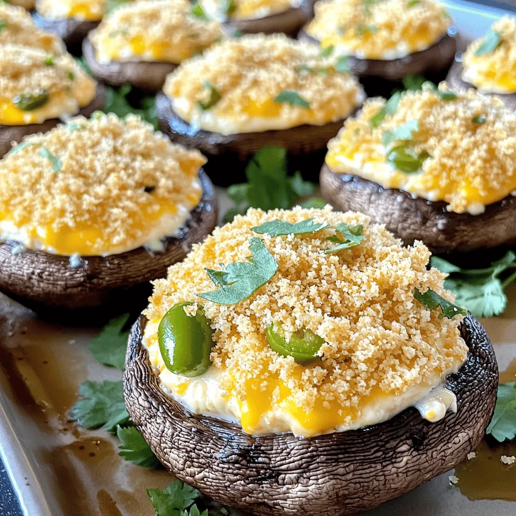To make Jalapeño Popper Stuffed Mushrooms, you will need a few key items. Here is a list of the main ingredients: - 12 large portobello mushrooms, stems removed - 4 oz cream cheese, softened - 1 cup shredded sharp cheddar cheese - 1/2 cup diced jalapeños (fresh or pickled) - 1/4 cup green onions, chopped - 1/2 cup panko breadcrumbs - 2 tablespoons olive oil - 1 teaspoon garlic powder - Salt and pepper to taste - 1 tablespoon fresh cilantro, chopped (for garnish) These ingredients make the dish rich and flavorful. The cream cheese and cheddar blend smoothly, while jalapeños add a spicy kick. Portobello mushrooms give a nice base, holding all the tasty filling. You can adjust this recipe to fit your needs. Here are some optional ingredients and substitutions: - Use different cheese like mozzarella or pepper jack for a unique flavor. - Swap green onions with chives for a milder taste. - If you want more heat, add diced serrano peppers. - For a different crunch, substitute panko with crushed tortilla chips. Feel free to mix and match these options. This dish is flexible and fun to customize based on your taste. Understanding the nutritional aspects helps you enjoy your food healthily. Here is a basic overview: - Calories: About 150 per serving - Protein: 6g - Fat: 10g - Carbohydrates: 8g - Fiber: 1g This dish is a great appetizer. It offers protein and healthy fats while keeping carbs moderate. You can enjoy these stuffed mushrooms without much guilt. For the full recipe, check the details above. Start by preheating your oven to 375°F (190°C). This step ensures your jalapeño popper stuffed mushrooms cook evenly. While the oven heats, line a baking sheet with parchment paper. This keeps the mushrooms from sticking and makes cleanup easy. In a mixing bowl, add the softened cream cheese, shredded cheddar cheese, diced jalapeños, and chopped green onions. Use a fork or spatula to mix these ingredients well. You want a smooth, creamy texture. Next, add garlic powder, salt, and pepper. Stir until everything is fully combined. This cheesy filling is key to the dish's flavor. Take your portobello mushrooms and remove the stems. Now, fill each mushroom cap with the jalapeño cheese mixture. Press down slightly to pack it in well. In another bowl, mix panko breadcrumbs with olive oil until coated. Sprinkle this breadcrumb mix over each stuffed mushroom. Place the mushrooms on the prepared baking sheet and bake for 20-25 minutes. Look for tender mushrooms and golden breadcrumbs. After baking, let them cool for a bit. Garnish with fresh cilantro for a pop of color. You can find the full recipe [here](#). To get the best texture and flavor in your Jalapeño Popper Stuffed Mushrooms, focus on your mushrooms. Choose large portobello mushrooms. They hold the filling well and cook evenly. Make sure to remove the stems, but keep the caps intact. A creamy filling is key. Mix cream cheese and cheddar well. This blend keeps the stuffing rich. For added flavor, use fresh jalapeños. They give a nice crunch and heat. Lastly, don’t skip the panko breadcrumbs. They provide a crispy topping that contrasts nicely with the soft mushroom. One common mistake is overcooking the mushrooms. Keep an eye on them while baking. You want them tender but not mushy. Another error is not packing the filling tightly. Press down the cheese mixture into the caps. This helps it stay in place while cooking. Also, avoid using too much salt. The cheese and jalapeños already have salt. Finally, don’t forget to let them cool a bit before serving. This allows the flavors to meld and makes them easier to handle. Making these stuffed mushrooms ahead of time is simple. You can prepare them up to a day in advance. After stuffing the mushrooms, cover them and place them in the fridge. When you’re ready to bake, just pop them in the oven. You may need to add a few extra minutes to the baking time. This method is great for parties or busy nights. Everyone loves a warm and tasty bite! For the full recipe on how to create these delightful treats, check out the complete recipe instructions. {{image_2}} You can make Jalapeño Popper Stuffed Mushrooms vegetarian by swapping out the cheese. Try using vegan cream cheese or cashew cheese. You can also add more veggies for flavor. Consider mixing in chopped bell peppers, spinach, or corn. These options keep the dish fresh and tasty while making it meat-free. If you love heat, you can amp up the spice. Use different peppers like serrano or habanero instead of jalapeños. You can also add red pepper flakes or hot sauce to the cheese mixture. This gives your stuffed mushrooms a real kick. Just remember to taste as you go, so it’s not too hot for your guests! For a low-carb twist, think about using cauliflower or zucchini. You can rice cauliflower and mix it into your cheese filling. Alternatively, hollow out zucchini halves and stuff them instead of using mushrooms. Both options reduce carbs while still delivering great flavor. This makes your dish lighter but just as delicious. For the full recipe, check the details above! To keep your Jalapeño Popper Stuffed Mushrooms fresh, store them in an airtight container. Place a layer of paper towel at the bottom to absorb moisture. This helps keep the mushrooms from getting soggy. You can store them in the fridge for up to three days. When you're ready to enjoy your leftovers, reheat the mushrooms in the oven. Preheat the oven to 350°F (175°C). Place the mushrooms on a baking sheet and cover them with foil. Heat for about 10-15 minutes. This method keeps the mushrooms tender and the topping crispy. If you want to save your stuffed mushrooms for later, freezing is a great option. First, let the mushrooms cool completely. Then, place them in a single layer on a baking sheet and freeze for about two hours. After they are frozen, transfer them to a freezer-safe bag. Label the bag with the date and use them within three months. To reheat, bake them stra