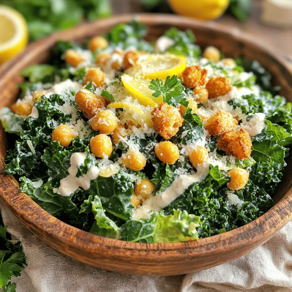 ![- 1 large bunch of kale, stems removed and leaves chopped - 1 can (15 oz) chickpeas, drained and rinsed - ½ cup homemade or store-bought Caesar dressing (ensure it’s alcohol-free) - ½ cup grated Parmesan cheese (or nutritional yeast for a vegan option) - 2 tablespoons olive oil - 1 teaspoon garlic powder - 1 lemon, zested and juiced - ½ cup croutons - Fresh parsley, chopped, for garnish (optional) Kale is a super green. It gives this salad a nice crunch and lots of nutrients. Crisp chickpeas add protein and flavor. Use Caesar dressing for that creamy touch. If you want a vegan option, try nutritional yeast instead of Parmesan cheese. You can adjust the taste with olive oil, garlic powder, and lemon. Olive oil adds richness, while garlic powder gives a nice kick. Lemon brightens the flavors and makes everything pop. Croutons bring a fun texture and extra crunch. Don't forget fresh parsley for a lovely touch! For the full recipe, please see the [Full Recipe]. Preheat your oven to 400°F (200°C). This step gets the oven hot for crispy chickpeas. In a bowl, toss the drained chickpeas with olive oil, garlic powder, salt, and pepper. Make sure each chickpea gets coated. Spread them out on a baking sheet in a single layer. This helps them roast evenly. Bake those chickpeas in the preheated oven for 25-30 minutes. They should turn golden brown and crispy. Shake the pan every 10 minutes. This helps the heat reach all sides for even cooking. For extra crispiness, make sure not to overcrowd the pan. Massaging kale is key to a tender salad. It makes the leaves softer and easier to eat. Place your chopped kale in a large bowl. Drizzle with about 1 tablespoon of olive oil, some lemon juice, and a pinch of salt. Use your hands to massage the kale for 2-3 minutes. You will notice it shrink and feel more tender. Once your chickpeas are crispy, take them out of the oven. Let them cool slightly before adding to the kale. Pour your Caesar dressing over the kale and chickpeas. Add the lemon zest and half of the grated Parmesan cheese. Toss everything together until the kale is well coated. Divide the salad into bowls. Top each bowl with the remaining Parmesan cheese, croutons, and chopped parsley for garnish. This adds color and flavor to your dish. Enjoy your fresh and healthy Kale Caesar Salad with Crispy Chickpeas. For full details, check out the Full Recipe. To get great roasted chickpeas, avoid common mistakes. First, make sure the chickpeas are dry. If they are wet, they won’t crisp up. Next, spread them out on the baking sheet. If they are too close, they will steam, not roast. For seasoning, try different flavors. You can use smoked paprika for a bit of heat. Or sprinkle some cumin for a warm taste. A hint of lemon zest can add brightness. Feel free to mix and match what you like! When making your own Caesar dressing, use fresh ingredients. Start with good-quality olive oil and fresh garlic. If you can, use anchovies for true flavor. Blend everything until smooth. If you want an alcohol-free dressing, that’s easy! Skip the wine and use lemon juice instead. You can also add a bit of Dijon mustard for extra flavor. This keeps the taste rich without any alcohol. For storing your salad, keep it in an airtight container. This helps it stay fresh longer. If you can, store the dressing separately. This way, the kale won’t get soggy. To reheat leftover chickpeas, use the oven. Spread them out on a baking sheet and warm at 350°F (175°C) for about 10 minutes. This keeps them crispy! Just remember to enjoy your salad as fresh as possible. For the full recipe, check out the full recipe section. {{image_2}} You can easily make this salad vegan. To replace Parmesan cheese, use nutritional yeast. It adds a cheesy flavor without dairy. You can also try cashew cream for a rich taste. For dressings, you have options too. A tahini-based dressing works well. Or blend avocado with lemon juice for creaminess. Want to boost the protein? Add grilled chicken. It gives great flavor and makes the salad heartier. If you prefer plant-based options, try tofu. Marinate it in soy sauce and bake until golden. Both options will make your salad more filling. To keep things fresh, think about the season. In summer, add sweet cherry tomatoes or cucumber. In fall, consider roasted butternut squash for warmth. You can also add fruits like apples or pears for a sweet twist. These seasonal touches make your salad fun and exciting. To store Kale Caesar Salad, use airtight containers. For short-term storage, keep it in the fridge. This keeps your salad fresh for up to three days. If you want long-term storage, consider freezing the chickpeas separately. The kale does not freeze well. It loses its texture and flavor. - Short-term storage: Use airtight containers in the fridge for up to 3 days. - Long-term storage: Freeze crispy chickpeas in a separate bag. Reheating the chickpeas is simple. Use an oven or air fryer for the best results. This method helps keep them crispy. Simply preheat your oven to 350°F (175°C) and heat for 10 minutes. To keep your kale fresh, avoid reheating it. Instead, add fresh kale to your salad right before serving. This keeps the salad vibrant and crunchy. - Best methods for reheating chickpeas: Oven or air fryer at 350°F (175°C) for 10 minutes. - Keeping kale fresh: Add fresh kale right before serving. Yes, you can! If you want to switch it up, try these greens: - Spinach - Romaine lettuce - Swiss chard - Collard greens These options will change the taste and texture. Each green has its own unique flavor. Spinach is soft and sweet. Romaine gives a nice crunch. Collard greens are hearty and strong. Feel free to mix and match! Just remember to massage the greens for best results. Leftovers of this Kale Caesar Salad can last about 3 days. Store them in an airtight container in the fridge. The crispy chickpeas can stay fresh for a shorter time, about 2 days. They might lose their crunch after that. If