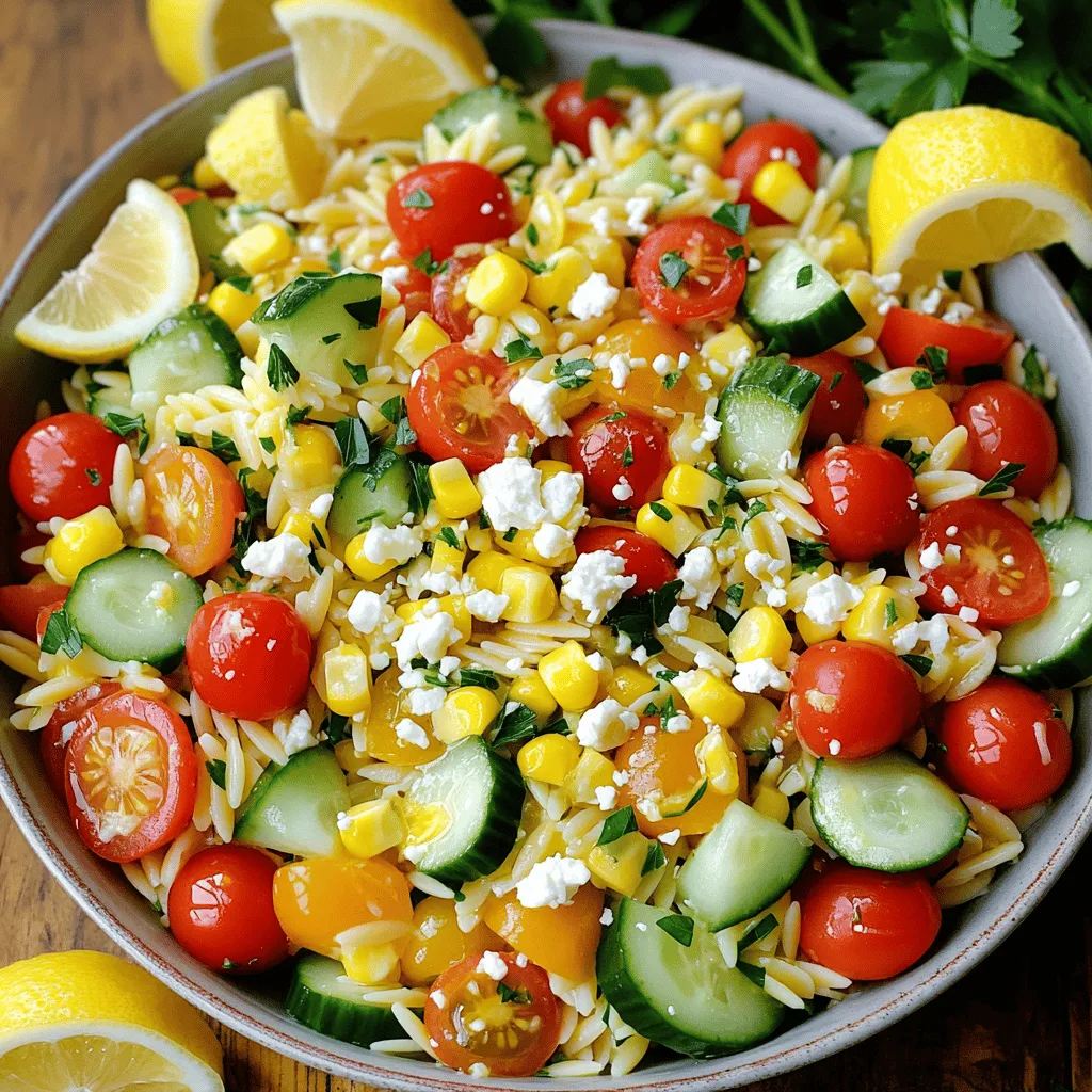 To make the Lemon Garlic Orzo Salad, start with the orzo pasta. This small pasta cooks quickly and absorbs flavors well. Use vegetable broth for cooking the orzo. It adds a rich taste that plain water cannot match. While the orzo cooks, chop fresh vegetables like cherry tomatoes and cucumber. They give the salad a nice crunch and vibrant color.