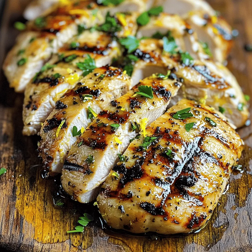Preheat your grill to medium-high heat before you start cooking. Remove the chicken from the marinade and throw away the leftover marinade. Place the chicken on the hot grill. Cook it for about 6-7 minutes on each side. Check the internal temperature; it should reach 165°F (75°C). Once done, take the chicken off the grill and let it rest for 5 minutes. This helps the juices stay inside the chicken. Finally, slice the chicken and sprinkle fresh parsley on top before serving. Enjoy your delicious Lemon Herb Grilled Chicken!