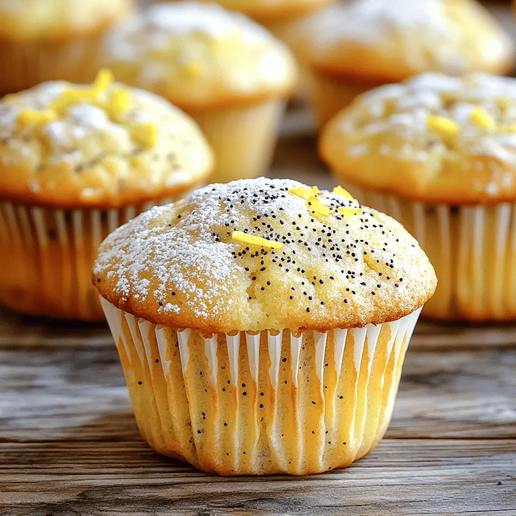 ![To make lemon poppy seed muffins, gather these key items: - 1 ½ cups all-purpose flour - 1 tablespoon poppy seeds - ½ cup unsalted butter, softened - 1 cup granulated sugar - Zest of 2 lemons These ingredients create a lovely balance of sweetness and tang. The poppy seeds add a nice crunch and visual appeal. The lemon zest gives each bite a bright flavor. You can enhance your muffins with these optional items: - ½ cup buttermilk - 2 tablespoons fresh lemon juice - Variations like add-ins or toppings Buttermilk makes the muffins soft and moist. Fresh lemon juice boosts the lemon flavor, making it even more vibrant. You might also want to add nuts or berries for extra texture and taste. For the full recipe, check [Full Recipe]. This will guide you through every step to bake these delightful muffins. 1. Preheat the oven and prepare the muffin tin: Set your oven to 350°F (175°C). Line your muffin tin with paper liners or grease it with cooking spray to avoid sticking. This will help the muffins pop right out. 2. Mix dry ingredients in a bowl: In a medium bowl, add 1 ½ cups of all-purpose flour, 1 tablespoon of poppy seeds, 1 teaspoon of baking powder, ½ teaspoon of baking soda, and ¼ teaspoon of salt. Whisk them together until they are well mixed. This helps distribute the leavening agents evenly. 3. Cream butter and sugar together: In a large mixing bowl, take ½ cup of softened unsalted butter and 1 cup of granulated sugar. Use an electric mixer to beat them together for about 2-3 minutes. You want this mixture to be light and fluffy. This step adds air and makes the muffins rise well. 1. Add eggs and flavorings: Crack in 2 large eggs, adding them one at a time. Beat well after each egg. Next, mix in 1 teaspoon of vanilla extract, the zest of 2 lemons, and 2 tablespoons of fresh lemon juice. The lemon zest brings a bright flavor that makes these muffins so refreshing. 2. Combine dry and wet mixtures: Gradually add the dry mix to the wet mixture. Do this in parts, alternating with ½ cup of buttermilk. Start and end with the dry mix. Mix until just combined. Avoid overmixing, as this can make the muffins tough. 1. Filling the muffin tin: Use a scoop to fill each muffin cup about two-thirds full with the batter. This gives them room to rise without spilling over. 2. Bake time and testing for doneness: Place the muffin tin in the oven and bake for 18-20 minutes. To test if they are done, insert a toothpick into the center of a muffin. If it comes out clean, they are ready. Let them cool in the pan for 5 minutes before moving them to a wire rack. For a detailed look at the ingredients, check the Full Recipe for Lemon Poppy Seed Muffins. Mixing well is key to great muffins. Start by combining dry ingredients first. This helps distribute the baking powder and soda evenly. When mixing wet ingredients, don’t rush. Cream the butter and sugar until light. This step adds air, making muffins fluffy. Measuring ingredients is also very important. Use a kitchen scale for accuracy. If you use cups, spoon flour into the cup, then level it off. Too much flour will make your muffins dense. To boost flavor, consider adding spices. A pinch of cinnamon or nutmeg can add warmth. You might also try adding almond extract for a twist. It pairs well with lemon. Maximize lemon flavor by using fresh zest and juice. Zest adds bright notes, while juice gives a nice tartness. If you want a stronger lemon taste, add more zest. Cooling muffins correctly is crucial. After baking, let them cool in the pan for about five minutes. This helps them set while still warm. Then, transfer them to a wire rack. This prevents sogginess and keeps them fluffy. For storage, keep muffins in an airtight container. This keeps them fresh for several days. If you have leftovers, store them at room temperature. Don’t put them in the fridge; that can dry them out. {{image_2}} You can make your lemon poppy seed muffins healthier with some simple swaps. Using whole wheat flour instead of all-purpose flour adds fiber. This change gives you a nutty flavor and a more wholesome texture. If you need a gluten-free option, try almond or coconut flour. Both work well and keep the muffins tasty. For sweetening, consider natural sweeteners like honey or maple syrup. These options add different flavors and cut down on refined sugar. Just remember to adjust the liquid in your recipe when using them. Lemon is bright and zesty, but you can mix it up! Try adding orange or lime zest for a fresh twist. These citrus flavors blend nicely and add depth to your muffins. You can also add fruits or nuts. Blueberries or raspberries bring sweetness and make your muffins moist. Chopped walnuts or almonds add crunch and a nice contrast. Just be careful not to add too much, as it can change the texture. Want to make mini or jumbo muffins? It’s easy! For mini muffins, bake them for only 10-12 minutes. Keep an eye on them to avoid overbaking. For jumbo muffins, fill the cups a bit more and bake for 22-25 minutes. Always check with a toothpick. If it comes out clean, your muffins are ready. Adjusting the baking time helps you create the perfect size for any occasion. To keep your lemon poppy seed muffins fresh at room temperature, place them in an airtight container. This helps to trap moisture and keep the muffins soft. You can also wrap them in plastic wrap or foil. Store them in a cool, dry place away from sunlight. These muffins stay fresh for about 2 to 3 days. If you want to refrigerate your muffins, wrap them well to avoid drying out. Use a plastic bag or an airtight container. Refrigerated muffins can last up to a week. Just remember, chilling can change the texture slightly, making them denser. For long-term storage, freezing is a great option. Place the muffins in a single layer on a baking sheet first. Freeze them for about an hour until firm. Then, transfer them to a freezer-safe bag or container. This way, they don’t stick together. Frozen muffins