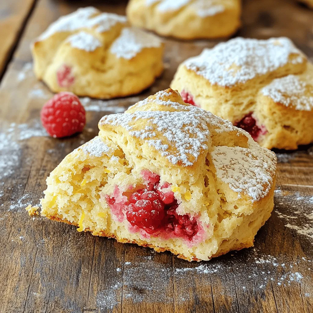 ![- 2 cups all-purpose flour - 1/3 cup granulated sugar - 1 tablespoon baking powder - 1/2 teaspoon salt - 1/4 cup cold unsalted butter, cubed - 1/2 cup heavy cream - 1 large egg - Zest of 1 lemon - 1 tablespoon lemon juice - 1 cup fresh (or frozen, thawed) raspberries - Optional: powdered sugar for dusting Gathering the right ingredients is key to making perfect Lemon Raspberry Scones. You will need two cups of all-purpose flour for a sturdy base. The sugar adds a touch of sweetness, while baking powder helps them rise. Salt balances the flavors. Use cold unsalted butter. It keeps the scones flaky. Heavy cream gives them a rich taste, and the egg adds moisture and helps bind everything together. The zest and juice from one lemon bring a bright, tangy flavor. Fresh raspberries add a burst of fruity goodness. If you like, dust your scones with powdered sugar for a sweet finish. For the full recipe, you can check the details provided above. Having everything ready will make the cooking process smooth and enjoyable. - Preheat your oven to 400°F (200°C) and line a baking sheet with parchment paper. - In a large bowl, combine 2 cups of all-purpose flour, 1/3 cup granulated sugar, 1 tablespoon baking powder, and 1/2 teaspoon salt. Whisk these dry ingredients together well. - Add 1/4 cup of cold unsalted butter, cubed, into the flour mixture. Use a pastry cutter or your fingers to cut the butter in until the mix looks like coarse crumbs. - In another bowl, whisk together 1/2 cup of heavy cream, 1 large egg, the zest of 1 lemon, and 1 tablespoon of lemon juice until it’s all mixed. - Pour the wet mixture into the dry ingredients. Gently mix it all together until just combined. Be careful not to overmix! - Fold in 1 cup of fresh raspberries, trying not to break them too much. - Turn the dough out onto a floured surface. Knead it a couple of times until it comes together. Pat it into a circle about 1 inch thick. - Cut the dough into 8 wedges and place them on the prepared baking sheet. - Bake for 15-18 minutes, or until the scones turn lightly golden brown. A toothpick should come out clean when inserted. - Let the scones cool on the sheet for 5 minutes before moving them to a wire rack. If you like, dust with powdered sugar before serving. Follow the [Full Recipe] for more details and tips to make your scones shine! To make great scones, avoid overmixing the dough. Mix just until combined. Overmixing makes the scones tough. You want them light and fluffy. When cutting butter into flour, use a pastry cutter or your fingers. Cold butter is key. It helps create that flaky texture. Aim for pea-sized pieces in the flour. This helps the scones rise nicely. Adding a splash of vanilla extract boosts the flavor. Just a teaspoon can make a difference. It adds warmth to the bright lemon and raspberry. You can also try different fruits. Blueberries, strawberries, or blackberries work well. Each fruit brings its unique taste. This way, you can enjoy new flavors all year. For the full recipe, check out the complete instructions above. Enjoy baking! {{image_2}} You can change up your Lemon Raspberry Scones based on what’s fresh. In spring and summer, try using blueberries or strawberries. They add a nice twist. You can also mix in citrus like orange or lime zest for a bright flavor. If you like a crunch, add nuts such as almonds or walnuts. Chopped nuts not only taste great but also give a nice texture to the scones. If you need gluten-free scones, use gluten-free flour blends. Many options work well without losing flavor. For those who want dairy-free scones, try almond milk or coconut cream instead of heavy cream. You can also use plant-based butter in place of regular butter. These changes help everyone enjoy the sweet and tangy delight of Lemon Raspberry Scones. You can find the full recipe linked above for more details. To keep your scones fresh, store them at room temperature. Place them in an airtight container. This helps maintain their soft texture. Try not to stack them, as they might squish. If you want to keep them longer, freeze them. Wrap each scone in plastic wrap, then place them in a freezer bag. This way, you can enjoy Lemon Raspberry Scones later. When you're ready to enjoy your scones again, reheating is simple. For quick reheating, use a microwave. Place a scone on a microwave-safe plate. Heat for about 10-15 seconds. This warms it up nicely but can make it soft. If you prefer a crisp texture, use an oven. Preheat the oven to 350°F (175°C). Bake the scones for about 5-10 minutes. This method keeps them nice and crunchy on the outside. Enjoy your scones like they just came out of the oven! - Can I use frozen raspberries in this recipe? Yes, you can use frozen raspberries. Just thaw and drain them first. This will help keep your dough from getting too wet. Thawed raspberries also work well and still taste great in the scones. - How do I know when scones are done baking? Scones are done when they turn lightly golden brown. Insert a toothpick into the center. If it comes out clean, your scones are ready. Keep an eye on them towards the end of baking for the best results. - What can I serve with Lemon Raspberry Scones? You can serve these scones with clotted cream, butter, or lemon curd. A dollop of whipped cream adds a nice touch too. Fresh fruit or a cup of tea pairs perfectly for a delightful treat. - Why did my scones not rise? If your scones did not rise, check your baking powder. It should be fresh and active. Also, avoid overmixing the dough. This can make the scones tough and prevent them from rising well. - How to fix dry scones? If your scones are dry, try adding a bit more cream next time. You can also brush the tops with cream before baking. This adds moisture and helps keep them soft. If they are already baked, serve them with a spread to add moisture. You now have a clear guide to making delicious lemon raspberry scones. We've covered everything from essential ingredients t