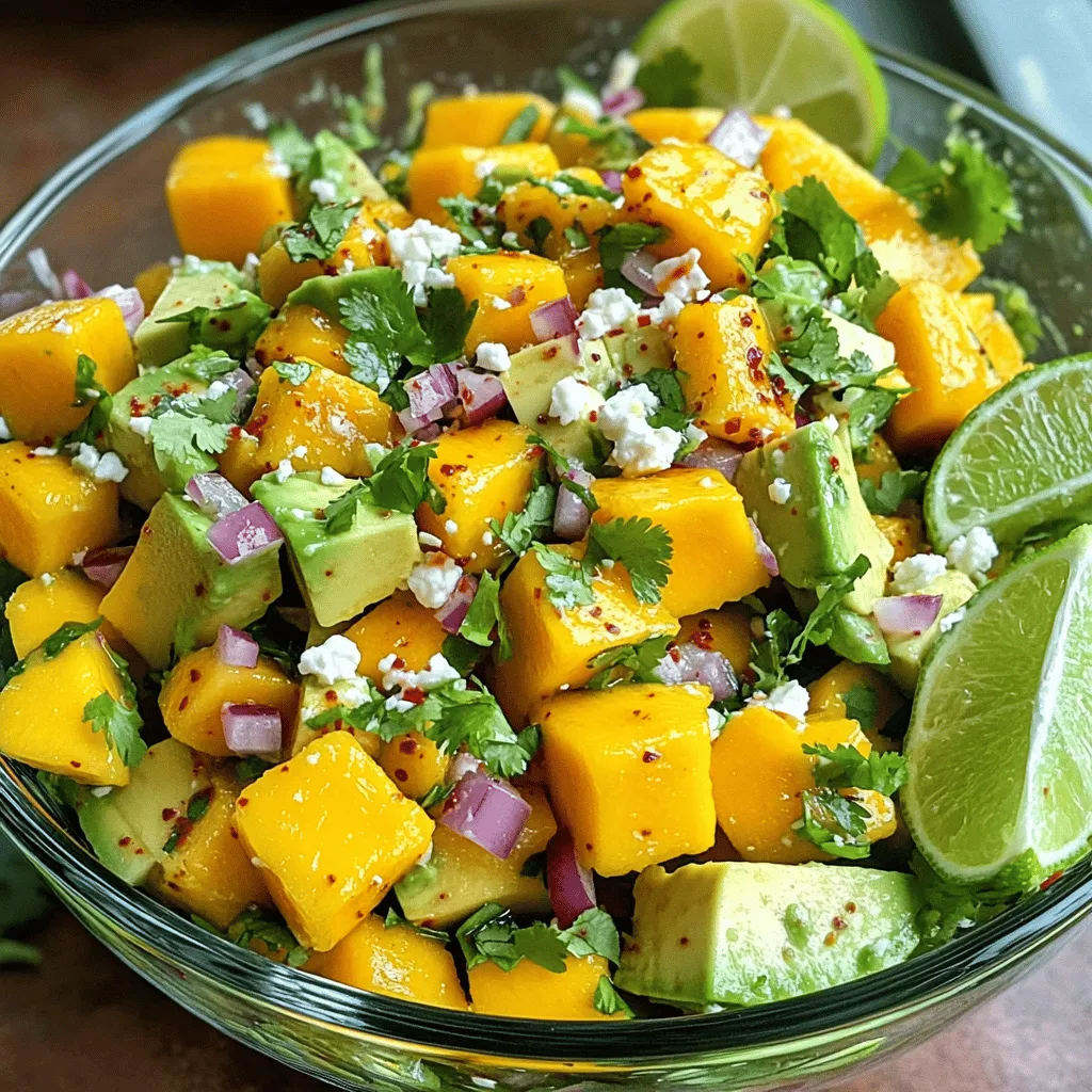 ![- 1 ripe mango, diced - 2 avocados, diced - 1 small red onion, finely chopped - 1 red chili, deseeded and minced - 2 tablespoons fresh lime juice - 1 tablespoon olive oil - Salt and pepper to taste - 1/4 cup cilantro, chopped - 1/4 cup crumbled feta cheese When I make my Mango Avocado Salad, I start with fresh, ripe mango. This fruit adds a sweet and juicy taste. I choose avocados that are soft, but not too mushy. They bring creaminess and richness. I also include red onion for crunch and a bit of bite. The red chili gives a nice kick without being too hot. For the dressing, I squeeze fresh lime juice. The lime adds brightness to the salad. A drizzle of olive oil gives it a smooth finish. I always season with salt and pepper to enhance the flavors. If I want to add more flair, I toss in chopped cilantro. It adds freshness and a pop of color. Sometimes, I sprinkle crumbled feta cheese on top. This adds a salty, creamy contrast to the sweet mango and rich avocado. You can find the full recipe [here]. 1. Start with the mango. Slice it into thin strips, then dice it into small cubes. A ripe mango is key for great flavor. 2. Next, take the avocados. Cut them in half, remove the pit, and scoop out the flesh. Dice the avocado into similar-sized cubes as the mango. 3. Now, chop the red onion. Use a small knife to finely chop it. Aim for small pieces to blend well in the salad. 4. Lastly, take the red chili. Cut it open, remove the seeds, and mince it finely. This adds a nice kick to the salad. 1. Grab a large mixing bowl. Combine the diced mango and avocados carefully. This avoids mashing the avocados. 2. Next, add the chopped red onion and minced chili to the bowl. This adds crunch and warmth to the mix. 3. In a small bowl, whisk together the fresh lime juice and olive oil. This dressing ties all the flavors together. 4. Drizzle the dressing over the fruit and vegetables in the mixing bowl. 1. Gently toss all the ingredients. Ensure everything gets coated in the dressing. 2. Season the salad with salt and pepper to taste. This brings out the flavors. 3. Fold in the chopped cilantro for freshness. If you like, sprinkle crumbled feta on top for a creamy finish. 4. Let the salad sit for about five minutes. This allows the flavors to meld nicely before serving. Try this Mango Avocado Salad for a fresh and tasty meal. Follow the [Full Recipe] for all details! How to prevent avocado browning: To keep your avocados fresh and green, use lime juice. The acid in lime juice slows browning. Squeeze some lime juice over the cut avocado right away. If you can, store the salad in an airtight container. This helps keep air out and keeps your salad looking bright. Keeping the salad from becoming mushy: Be gentle when mixing. Over-mixing can turn the salad into mush. Toss the ingredients lightly to keep the avocado and mango chunks intact. You can also chill the salad before serving. This keeps it firm and fresh. Best pairings with Mango Avocado Salad: This salad goes great with grilled chicken or fish. The fresh flavors balance well with rich proteins. You can also serve it with tortilla chips for a fun twist. The crunch of the chips adds a nice texture. Creative presentation ideas: Serve the salad in a clear glass bowl. This shows off the bright colors of the mango and avocado. You can also add lime wedges and cilantro on top for a pop of color. Use a large platter for a family-style presentation. Recommended utensils for easy preparation: A good chef's knife is key for dicing mango and avocado. A cutting board makes chopping easy and safe. Use a mixing bowl thatβs large enough to toss the salad without spilling. Serving dishes for a beautiful presentation: Choose a wide, shallow bowl for serving. This allows guests to see all the vibrant colors. A wooden serving spoon is perfect for scooping. It adds a rustic touch to your table. For the full recipe, check out the Tropical Twist Mango Avocado Salad. {{image_2}} If you can't find ripe mango, try using peaches or pineapple. Both fruits bring sweetness and a tropical feel. If avocados are not available, you can use creamy tahini or hummus for a similar texture. For a vegan option, skip the feta cheese. Instead, sprinkle some toasted sunflower seeds for crunch and nutrition. To add some spice, mix in chopped jalapeΓ±os or a dash of cayenne pepper. Fresh herbs like basil or mint can brighten the salad. If you want to change the cheese, consider goat cheese or even a sprinkle of Parmesan for a unique twist. These options elevate the taste without losing the fresh vibe. In summer, toss in some fresh berries like strawberries or blueberries for a burst of color. In fall, diced apples or pears make a lovely addition. For holiday meals, you can mix in roasted sweet potatoes or pomegranate seeds for a festive touch. These fruits and veggies not only enhance flavor but also make the salad visually appealing. For the full recipe, check out the Tropical Twist Mango Avocado Salad π₯π₯. To keep your Mango Avocado Salad fresh, store it in an airtight container. This helps prevent air from making the salad brown. Place the container in the fridge. The ideal temperature for the fridge is around 35Β°F to 38Β°F (1.6Β°C to 3.3Β°C). Use the salad within two days for the best taste. Can you freeze Mango Avocado Salad? I do not recommend freezing this salad. The texture of the avocado and mango changes when frozen. If you freeze it, the salad may become mushy when thawed. It's best to enjoy it fresh. If you have leftovers, store them in the fridge instead. How long can you keep the salad? You can keep it in the fridge for up to two days. Signs that the salad has gone bad include a sour smell, brown avocado, or slimy texture. If you see any of these signs, itβs best to toss the salad. Always trust your senses when checking food freshness. It takes just 15 minutes to make this salad. You spend 10 minutes prepping the ingredients. This includes dicing the mango and a