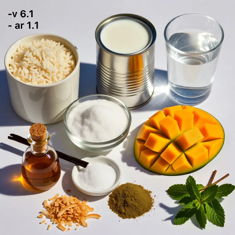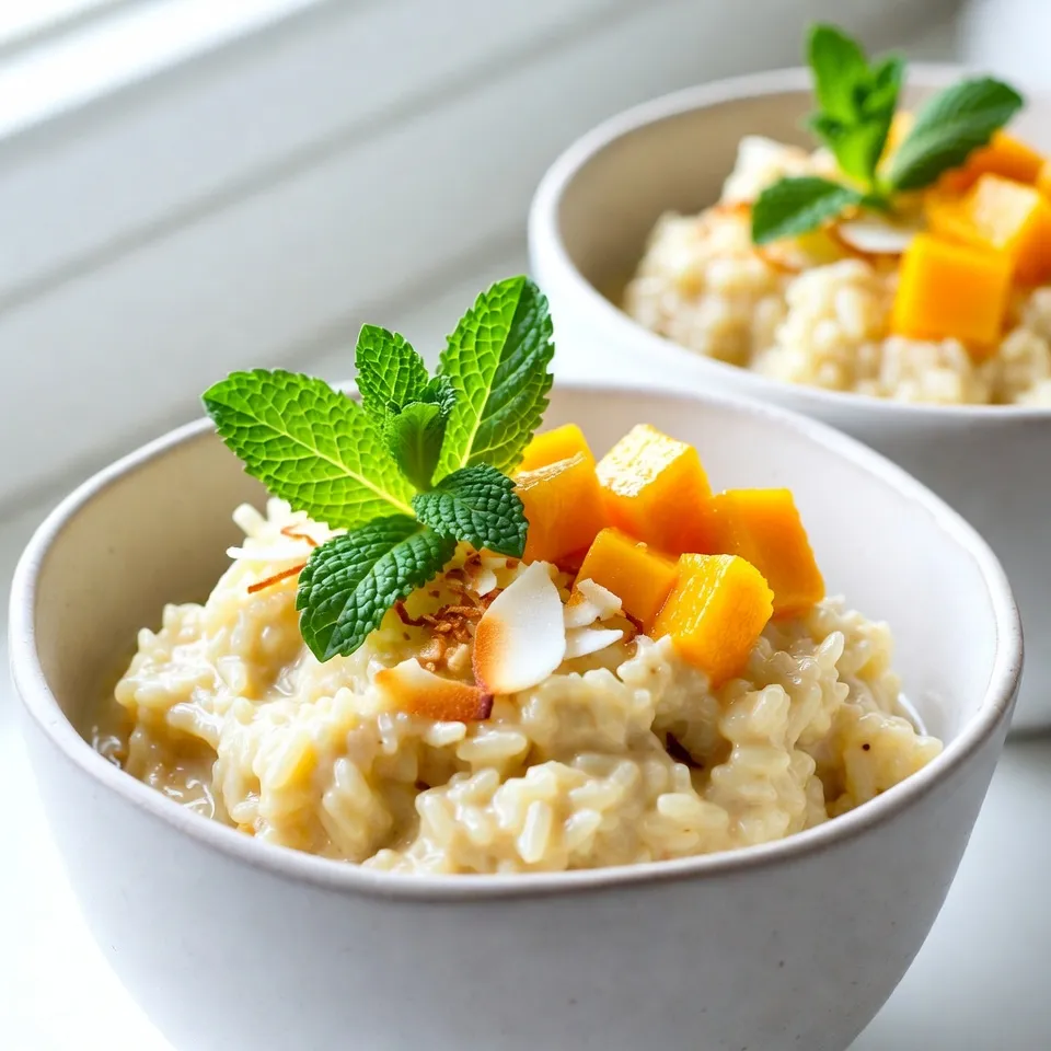 To make the Mango Coconut Rice Pudding, you need these simple items: - 1 cup Arborio rice - 2 cups coconut milk - 1 cup water - 1/2 cup sugar - 1 ripe mango, diced - 1 teaspoon vanilla extract - 1/4 teaspoon salt - 1/2 teaspoon ground cardamom - Toasted coconut flakes (for garnish) - Fresh mint leaves (for garnish) Each ingredient plays a key role in making this dessert creamy, sweet, and full of flavor. The Arborio rice gives it a nice texture, while coconut milk adds a rich taste. Mango brings a fruity twist that makes every bite special. You can find these ingredients at your local grocery store. Fresh mango is best, but you can use frozen if that’s easier. The toasted coconut flakes and mint leaves are perfect for a beautiful finish. They not only look great but also add extra flavor. Enjoy gathering these items for your delightful dessert! {{ingredient_image_1}} - Rinse the Arborio rice under cold water. This helps remove extra starch. - Dice the ripe mango into small pieces. You want them to be bite-sized. - In a medium saucepan, combine the rice, coconut milk, and water. Stir well. - Add the sugar, salt, and ground cardamom to the mix. Stir to blend. - Bring the mixture to a simmer over medium heat. Keep stirring to prevent sticking. - Lower the heat and cover the saucepan. Let it simmer for 20-25 minutes. The rice should be tender. - Once cooked, remove from heat and stir in the vanilla extract and diced mango. Mix gently. - Let the pudding cool for a bit at room temperature. You can also chill it in the fridge for 30 minutes. - To serve, spoon the pudding into bowls. Top with toasted coconut flakes and fresh mint leaves for a nice touch. To make your rice pudding creamy, use Arborio rice. This rice has a high starch content, which helps thicken the pudding. When you cook it, the starch releases and creates a smooth texture. Stir the mixture often to keep it from sticking to the bottom of the pot. When simmering, start with medium heat. This brings the mix to a gentle boil. Once it boils, reduce the heat to low and cover the pot. Let it simmer for 20 to 25 minutes. This slow cooking makes the rice tender and creamy. To add depth to your pudding, consider spices like cinnamon or nutmeg. These spices boost the flavor profile without overpowering the dish. You can also experiment with the sweetness. If you like it sweeter, add a little more sugar. Taste as you go, so it suits your preference. For a beautiful presentation, use toasted coconut flakes as a garnish. This adds a nice crunch. Fresh mint leaves also bring a pop of color and freshness. Serve the pudding in clear cups or bowls to show off its creamy texture and vibrant mango pieces. Pro Tips Use Fresh Mango: For the best flavor, choose a ripe mango that is slightly soft to the touch. This will enhance the sweetness and freshness of your pudding. Control the Creaminess: If you prefer a creamier texture, you can add an extra 1/2 cup of coconut milk towards the end of cooking. Cardamom Variation: Experiment with different spices like cinnamon or nutmeg instead of cardamom for a unique twist on the flavor profile. Serving Suggestions: Serve warm or chilled, and consider adding a drizzle of honey or maple syrup on top for extra sweetness. {{image_2}} You can try different rice types for this pudding. Jasmine rice gives a light scent. Long-grain rice works too, but it may change the texture. Arborio rice is ideal for creaminess. For milk options, you can use almond or oat milk. These choices give a unique taste. If you want a richer flavor, try heavy cream. Each swap changes the pudding a bit. Adding fruits or nuts can enhance the taste. Chopped bananas or berries work well. You can also mix in nuts like almonds or cashews for crunch. Using flavored extracts can add depth. Almond or coconut extract can make it special. Just a few drops can change the whole dish. If you want a vegan version, simply use coconut milk and skip the dairy. This pudding remains creamy and rich without milk. For a gluten-free option, this recipe is already safe! Just ensure your ingredients are certified gluten-free. You can enjoy this treat without worry. To store leftover mango coconut rice pudding, place it in an airtight container. Refrigerate it within two hours to keep it fresh. The pudding will stay good in the fridge for up to three days. If you want to keep it longer, you can freeze it. Use a freezer-safe container and leave some space at the top for expansion. It can last up to two months in the freezer. When stored properly, the pudding lasts three days in the fridge. In the freezer, it can last up to two months. Signs of spoilage include an off smell, a change in texture, or mold. If you notice any of these, it's best to throw it away. Always check for freshness before eating leftovers. To reheat the pudding, gently warm it in a saucepan over low heat. Stir it often to keep it smooth. You can also use the microwave. Heat it in short bursts, stirring in between. This method helps prevent texture loss. If the pudding seems thick after reheating, add a splash of coconut milk to restore creaminess. You can use short-grain rice or sushi rice. Both types have a similar texture. These rice types will help you achieve a creamy pudding. Avoid long-grain rice, as it won't work well in this recipe. Yes, you can make this pudding a day before. Just store it in the fridge. This will help the flavors blend nicely. When ready to serve, simply garnish with coconut flakes and mint. Absolutely! Canned coconut milk works great in this recipe. It adds rich flavor and creaminess. Make sure to shake the can well before using for the best results. The pudding needs about 30 minutes to cool in the fridge. If you prefer it at room temperature, let it cool for about 15 minutes. Cooling helps the flavors develop fully. Yes, frozen mango is a good option. Just thaw it before adding to the pudding. This will ensure a nice texture and flavor. Fresh or frozen mango both t