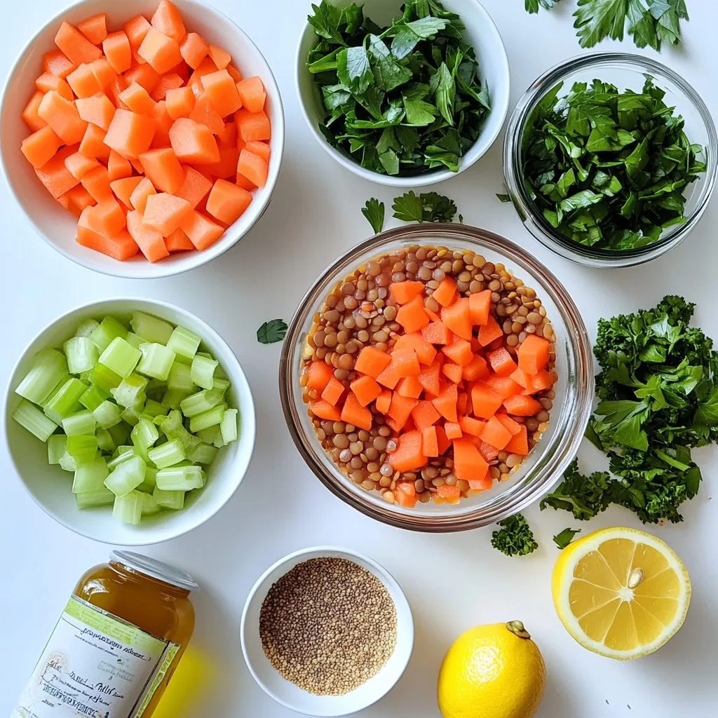 Lentils form the base of this soup. They are rich in protein and fiber. You can use green or brown lentils. Both types are tasty and nutritious. Next, we have fresh veggies. Onion, carrots, celery, and garlic add layers of flavor. They make the soup hearty and filling. The diced tomatoes bring natural sweetness and acidity. Vegetable broth ties it all together, making a warm, savory mix.