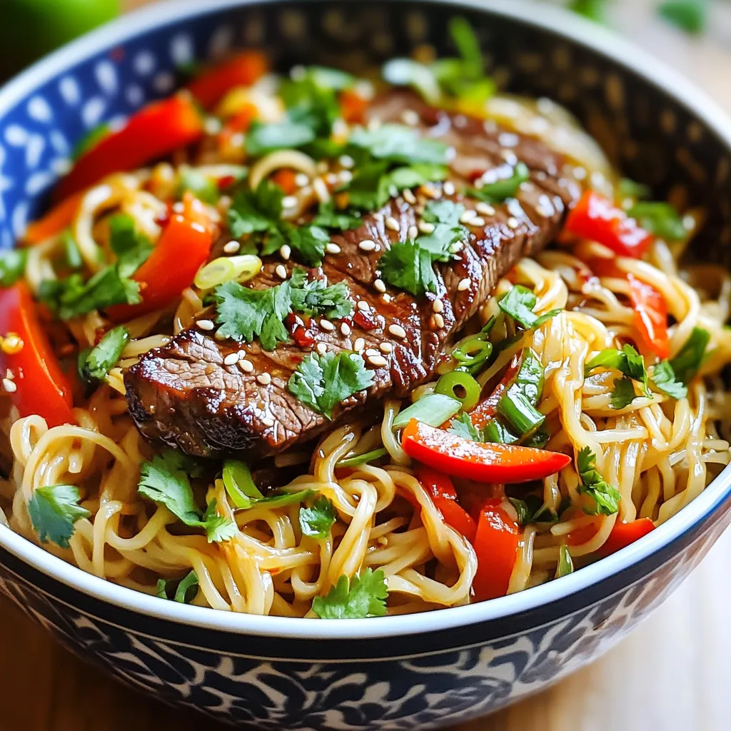 Now it’s time to bring everything together. Add the cooked steak back into the skillet with the bell pepper. Then, toss in the drained rice noodles. Add chili paste, soy sauce, sesame oil, and lime juice. Stir-fry for another two to three minutes. This ensures everything is coated well and heated through. Finally, top with chopped green onions and fresh cilantro before serving. Enjoy your delicious meal!