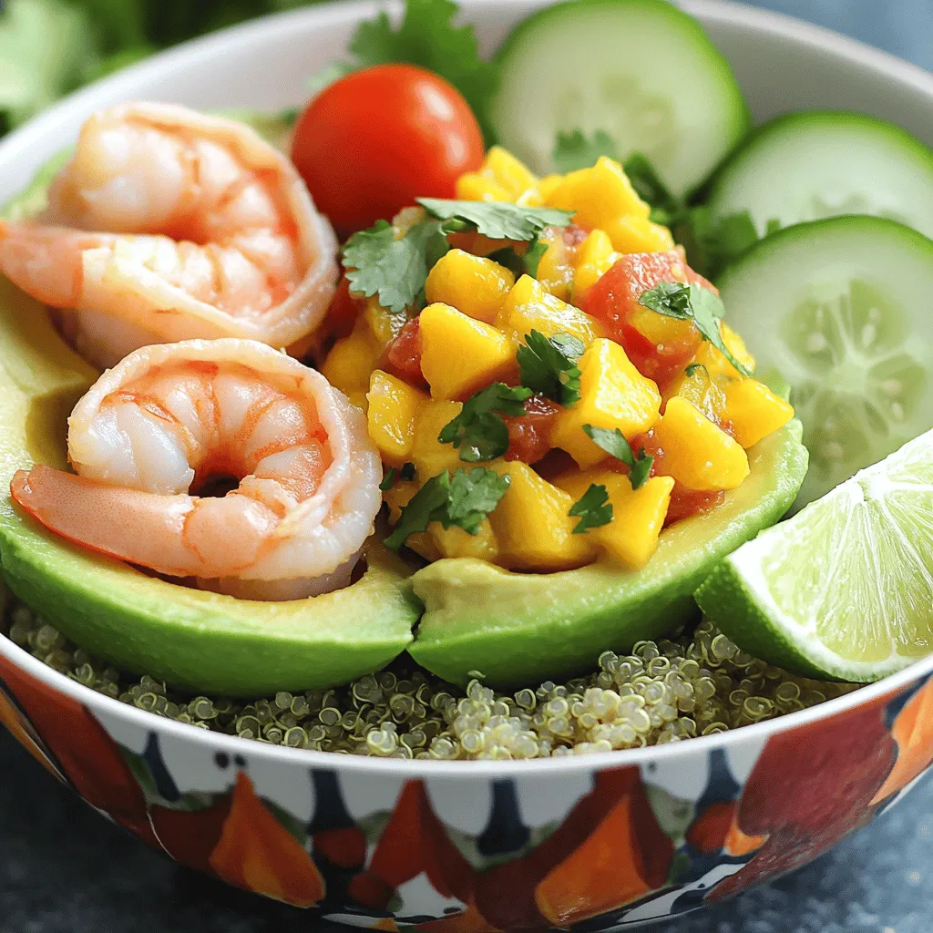 . Enjoy crafting these bowls with ease and confidence! - In a medium bowl, combine diced mango, minced jalapeño, red onion, and cilantro. - Drizzle the mixture with lime juice and season with salt to taste. - Stir gently to combine and set aside to let the flavors meld. - Heat olive oil in a large skillet over medium-high heat. - Season the shrimp with salt and pepper while the oil heats. - Cook the shrimp for about 2-3 minutes on each side until they turn pink and opaque. - Start by placing a generous scoop of cooked quinoa at the bottom of each serving bowl. - Add halved avocados to each bowl, spooning out and slicing the flesh if you like. - Top the quinoa and avocado with the cooked shrimp, halved cherry tomatoes, and diced cucumber. - Finally, spoon a generous amount of mango salsa over the shrimp and veggies. - Sprinkle fresh cilantro on top for garnish. For the full recipe, check out the earlier section! - Ensure shrimp are cooked just until pink for tenderness. - Use fresh ingredients for the best flavor. Cooking shrimp can be tricky. You want them tender, not rubbery. When they turn pink, they are ready. Cook them for only 2-3 minutes on each side. If you overcook, they will be tough. Fresh ingredients make a big difference in taste. Use ripe avocados and juicy tomatoes. They will elevate your dish. - Serve with lime wedges on the side. - Consider colorful bowls for a visually appealing presentation. Adding lime wedges gives a zesty kick. The bright green avocado and the colorful mango salsa look great in a vibrant bowl. This makes your meal more fun! Use different colored bowls to impress your guests. They will love the look as much as the taste. {{image_2}} You can switch up the shrimp in this dish. Grilled chicken works great and adds a nice texture. If you prefer a plant-based option, try tofu. It absorbs flavors well and is very filling. For a fun twist, add crispy bacon or smoked salmon. Both will give your bowl a unique and savory kick. The mango salsa is fresh and bright, but feel free to experiment. Pineapple or peach salsa adds a fruity twist that can surprise your taste buds! You can also mix in black beans or corn. These add texture and a burst of flavor to every bite. You’ll have endless options to keep your meals exciting. For the full recipe, check out the complete instructions and details. Store your assembled bowls in an airtight container for up to 1 day. This keeps the flavors fresh. Remember to keep the mango salsa separate. This helps to maintain its bright taste and texture. You can freeze shrimp, but it is not a great idea for avocados and salsa. These ingredients do not freeze well and may lose their taste. If you freeze shrimp, thaw it before reheating. This ensures you enjoy tasty and safe shrimp every time you serve your bowl. Yes, you can prepare the mango salsa and cook the shrimp ahead. Just assemble the bowls right before you serve. To stop avocados from browning, squeeze lime juice over them. The acid in the juice slows down the process. These bowls go well with a light salad. They also work as a standalone meal, so you can enjoy them alone. If you want milder salsa, just leave out the jalapeño. For more heat, add extra jalapeño to taste. The shrimp avocado bowls offer a fresh and colorful meal, easy to prepare. We explored key ingredients like shrimp, avocados, and quinoa, along with the zesty mango salsa. Cooking tips helped ensure tender shrimp, while variations opened the door to creative options. Remember, fresh ingredients make all the difference. Store leftovers properly to enjoy the tasty flavors longer. Dive in and enjoy your healthy, vibrant bowls today!](https://homecookingstyle.com/wp-content/uploads/2025/05/aee0e685-8ad5-4aa8-adb0-40c1a330015d-768x768.webp)