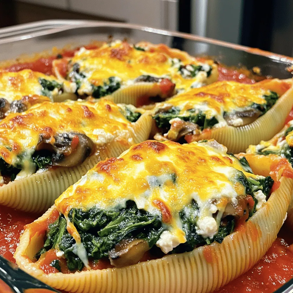 I love using fresh ingredients for this dish. The jumbo pasta shells hold the filling well. Fresh spinach adds a nice green color and a healthy twist. Mushrooms bring a rich and earthy flavor. Ricotta offers a creamy texture. Parmesan adds a salty kick, while mozzarella gives that gooey finish. Garlic enhances everything with its warm aroma. Dried oregano adds depth, and olive oil keeps it moist. Don’t forget salt and pepper for more taste. Finally, marinara sauce ties it all together with its tangy sweetness.