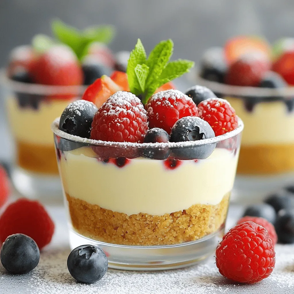 ![To make these no-bake cheesecake cups, you need a few simple ingredients. Here’s what you will need: - 1 cup cream cheese, softened - 1 cup Greek yogurt - 1/2 cup powdered sugar - 1 teaspoon vanilla extract - 1/4 cup heavy cream - 1 cup mixed berries (strawberries, blueberries, raspberries) - 1/2 cup crushed graham crackers - 2 tablespoons melted butter - Fresh mint leaves for garnish These ingredients create a creamy, sweet treat that anyone can enjoy. I love using Greek yogurt because it adds a nice tang and makes the cheesecake lighter. The cream cheese gives it a rich flavor. The berries on top add freshness and a pop of color. You can mix and match your favorite berries for a fun twist. The crushed graham crackers and melted butter form a tasty crust at the bottom. This adds a nice crunch to each bite. You can use store-bought graham crackers or make your own. Both options work well. Don't forget the fresh mint leaves! They add a nice touch and enhance the look. This recipe is perfect for gatherings or a sweet treat at home. You can find the full recipe [here]. To make no-bake cheesecake cups, follow these steps closely. - Mixing the cream cheese and yogurt base Start with a mixing bowl. Add the softened cream cheese, Greek yogurt, powdered sugar, and vanilla extract. Use an electric mixer to blend until smooth. This step creates a creamy base for your cheesecake. - Whipping the heavy cream to stiff peaks In a separate bowl, pour the heavy cream. Whip it with a mixer until stiff peaks form. This means the cream should hold its shape well. Stiff peaks add lightness to the cheesecake. - Combining the two mixtures for the cheesecake filling Gently fold the whipped cream into the cream cheese mixture. Use a spatula to avoid deflating the whipped cream. This creates a fluffy cheesecake filling. - Preparing the graham cracker crust In another bowl, mix crushed graham crackers with melted butter. Stir until the crumbs are moistened. This mixture serves as the crunchy base for your cups. - Layering the cheesecake cups Take your serving cups or bowls. Add a layer of the graham cracker mixture at the bottom. Press it down lightly to form a crust. Then, spoon the cheesecake mixture on top, filling each cup to the rim. - Chilling for the best texture Place the filled cups in the refrigerator. Chill them for at least two hours before serving. This step allows the cheesecake to set properly, ensuring the best texture. Follow these steps for a simple and delicious treat. For the full recipe, check out the details above. - Ensuring cream cheese is fully softened: Always start with cream cheese at room temperature. This step makes mixing easy and helps avoid lumps. If you forget, you can cut it into small pieces and microwave it for about 10 seconds. Just be careful not to melt it! - Folding whipped cream properly to maintain lightness: When you fold in the whipped cream, use a gentle motion. Start from the bottom of the bowl and lift the mixture. This keeps your cheesecake light and fluffy. If you stir too hard, your cream can deflate. - Adjusting sweetness to taste: Everyone has different preferences. Taste your filling before chilling it. If you like it sweeter, add more powdered sugar. You can also switch it up with honey or maple syrup for a new twist. - Creative ways to layer the cups: Layering is fun! Start with a graham cracker base, then add a creamy layer. After that, add your mixed berries and repeat. You can even create a rainbow effect with different fruits for a stunning look. - Recommended glassware for serving: Use clear cups or jars to show off the layers. Small mason jars work great! They are cute and easy to handle. For a fancy touch, try using elegant dessert glasses. - Preferred toppings besides berries: While berries are great, you can use other toppings too. Try crushed cookies like Oreos or a drizzle of caramel sauce. Shredded coconut also adds a nice texture. - Enhancing flavor with citrus zest or chocolate: Grate some lemon or lime zest on top for a fresh kick. If you’re a chocolate lover, sprinkle mini chocolate chips for extra sweetness. This adds both flavor and visual appeal to your treats. For the full recipe, check out [Full Recipe]. {{image_2}} You can have fun with your no-bake cheesecake cups by trying different flavors. - Chocolate no-bake cheesecake cups: To make these, add 1/2 cup of melted chocolate to the cream cheese mixture. This rich flavor is perfect for chocolate lovers. - Tropical fruit no-bake cheesecake cups: Use 1 cup of crushed pineapple and substitute the berries. You can also add shredded coconut for an extra tropical twist. - Coffee-flavored no-bake cheesecake cups: Mix in 2 tablespoons of instant coffee granules into the cream cheese. This gives a nice coffee kick that many will love. You can also adjust the recipe to fit special diets. - Gluten-free options: Substitute crushed graham crackers with gluten-free cookies or nuts. This way, everyone can enjoy the treat. - Dairy-free and vegan alternatives: You can replace cream cheese with vegan cream cheese and Greek yogurt with coconut yogurt. Also, use coconut cream instead of heavy cream for a rich taste. These variations make the no-bake cheesecake cups fun and adaptable for all. For the full recipe, check out the detailed steps above. To keep your no-bake cheesecake cups fresh, store them in the fridge. Place them in an airtight container. This will help prevent them from absorbing other odors. You should also cover them with plastic wrap if you don't have a container. If you want to save them for later, freezing is an option. To freeze, place the cups in a freezer-safe container. You can also wrap each cup tightly in plastic wrap. This stops freezer burn. When ready to eat, let them thaw in the fridge overnight. In the fridge, your cheesecake cups can last about 3 to 5 days. Check for any signs of spoilage before you serve them. If they smell sour or look discolored, it’s best to throw