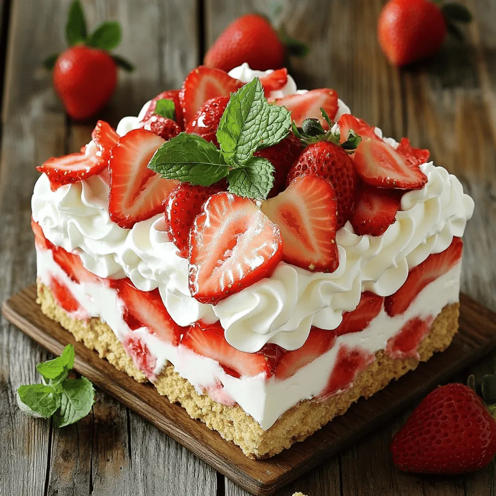 Now it’s time to layer your cake. Start with a layer of graham crackers at the bottom of a rectangular or square dish. Make sure they cover the bottom completely. Next, spread a layer of the whipped cream over the crackers. Then, add a layer of the sugared strawberries. Repeat this process: more graham crackers, more whipped cream, and strawberries. Keep going until you use all your ingredients. Finish with a layer of whipped cream on top. After that, cover the dish with plastic wrap. Place it in the fridge for at least four hours, or overnight if you can wait. This lets the graham crackers soak up the strawberry juice and soften. When ready to serve, slice into squares and enjoy!