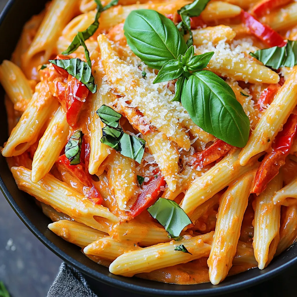 When the pasta is done, turn off the heat. Stir in the grated Parmesan cheese. Mix until it melts and the sauce is creamy. If the sauce is too thick, add a splash of vegetable broth to thin it out. Season with salt and pepper to your taste. For serving, use shallow bowls. Garnish with fresh basil leaves and a sprinkle of extra Parmesan. This adds a nice touch and color to your dish. Enjoy your creamy roasted red pepper pasta!