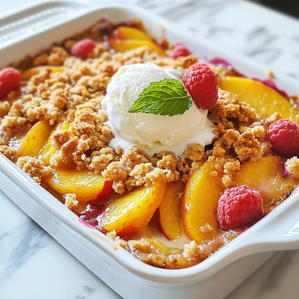 - Fresh and Fruity: This crumble showcases the delightful combination of juicy peaches and tart raspberries, making every bite a burst of flavor.