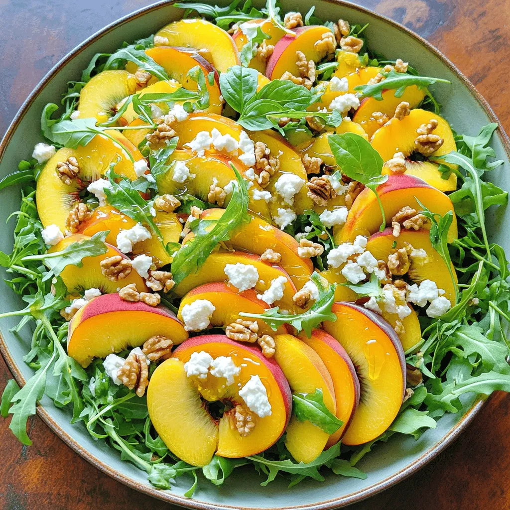 Now, let’s build our salad. Start with a large salad bowl. Place two cups of arugula or mixed greens at the bottom. This will be your fresh base. Next, take three ripe peaches and slice them. Arrange the peach slices on top of the greens. This adds color and sweetness. Then, add a quarter cup of crumbled feta cheese. This cheese gives a creamy taste. Sprinkle a quarter cup of toasted walnuts over everything. They add a nice crunch. For a fresh kick, sprinkle one tablespoon of finely chopped basil and one tablespoon of finely chopped mint. These herbs enhance the salad’s flavor.