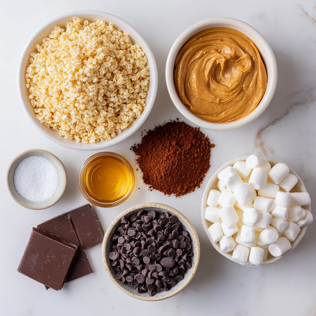 To make Peanut Butter Chocolate Rice Krispie Treats, gather these main ingredients: