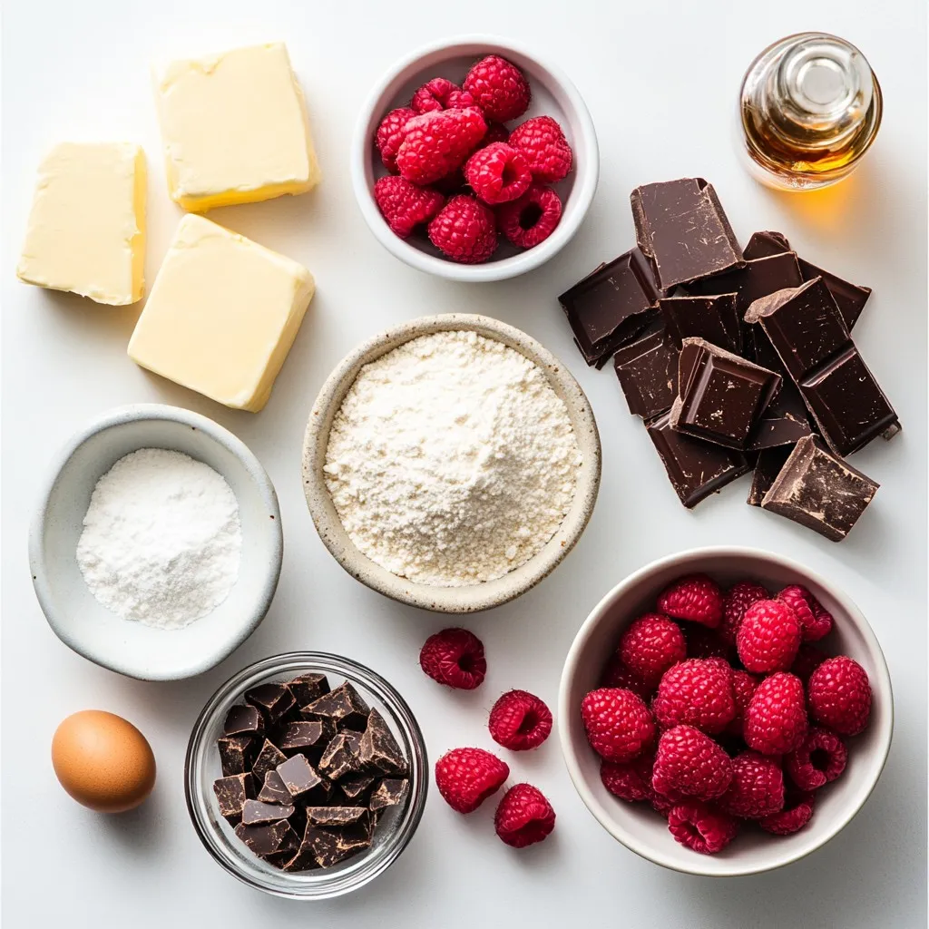 The main ingredients create the rich brownie base. The butter and dark chocolate mix to give moisture and depth. The sugar adds sweetness, while eggs help with texture. Flour provides structure, and salt enhances flavor. The fresh raspberries add a burst of tartness, making each bite special.
