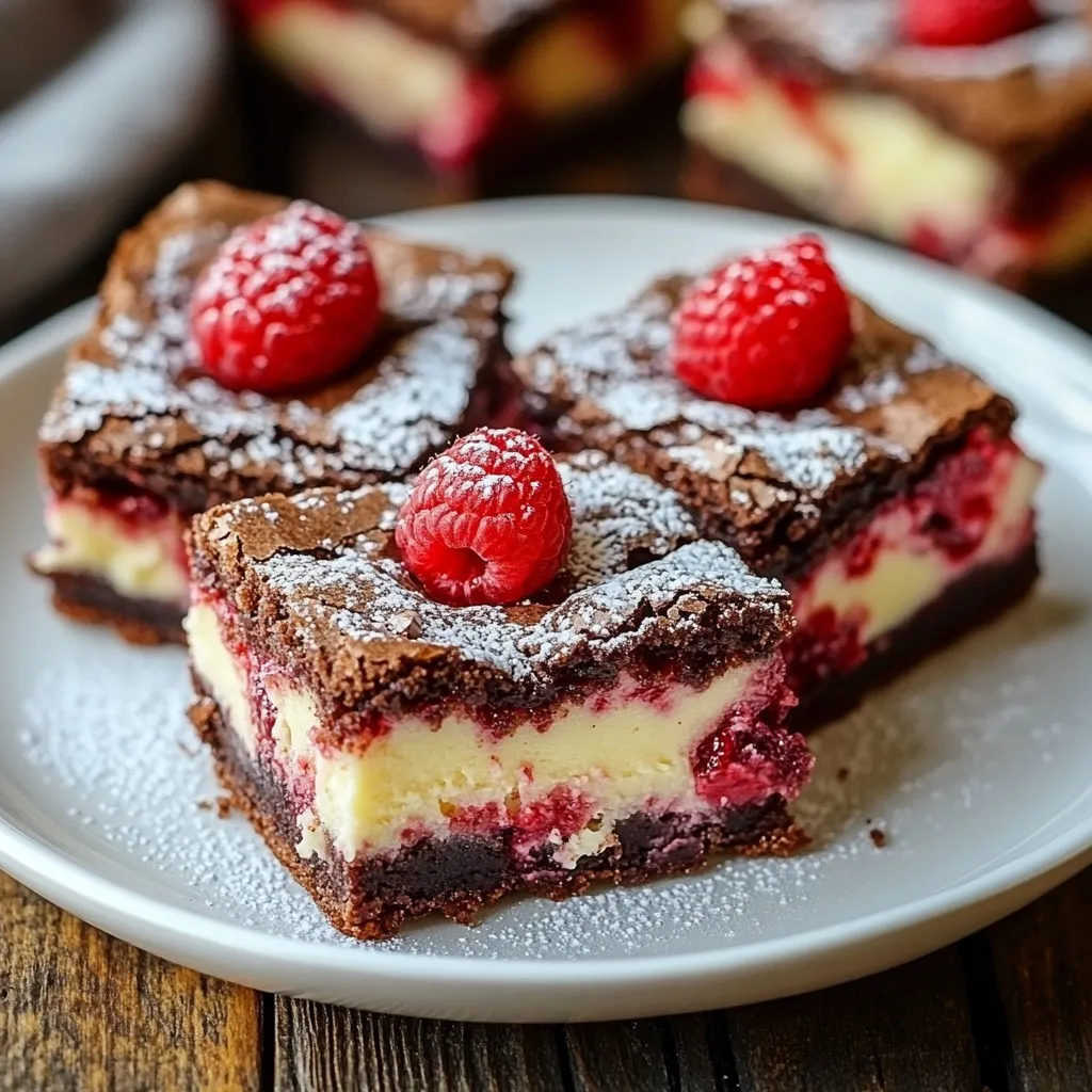 - 1 cup unsalted butter (2 sticks) - 8 ounces dark chocolate (chopped) - 1 1/4 cups granulated sugar - 1 teaspoon vanilla extract - 4 large eggs - 1 cup all-purpose flour - 1/2 teaspoon salt - 1 cup fresh raspberries The main ingredients create the rich brownie base. The butter and dark chocolate mix to give moisture and depth. The sugar adds sweetness, while eggs help with texture. Flour provides structure, and salt enhances flavor. The fresh raspberries add a burst of tartness, making each bite special. - 8 ounces cream cheese (softened) - 1/4 cup granulated sugar - 1 teaspoon vanilla extract - 1 large egg These ingredients create the creamy cheesecake layer. The softened cream cheese blends well with sugar and vanilla. The egg binds everything together for a smooth texture. This layer contrasts beautifully with the dense brownie base. - Powdered sugar for dusting - Extra fresh raspberries for garnish Adding toppings can elevate your dessert. A light dusting of powdered sugar adds a sweet finish. Extra raspberries on top bring freshness and a pop of color. These small touches make your brownies look and taste even better. {{ingredient_image_1}} Start by preheating your oven to 350°F (175°C). Grab a 9x13 inch baking pan. Line the pan with parchment paper. Leave some paper hanging over the edges. This helps you lift the brownies out later. In a medium saucepan, add 1 cup of unsalted butter and 8 ounces of chopped dark chocolate. Melt them together over low heat. Stir constantly until the mixture is smooth. Once melted, remove it from heat and let it cool slightly. Stir in 1 1/4 cups of granulated sugar and 1 teaspoon of vanilla extract. Mix well until combined. Then, add 4 large eggs, one at a time. Beat well after each egg until fully mixed. Next, sift in 1 cup of all-purpose flour and 1/2 teaspoon of salt. Fold gently until just combined. Be careful not to overmix. Pour half of the brownie batter into the prepared pan. Smooth it out evenly. Sprinkle 1 cup of fresh raspberries on top. In another bowl, beat 8 ounces of softened cream cheese with 1/4 cup of sugar, 1 teaspoon of vanilla, and 1 egg. Mix until creamy and smooth. Drop spoonfuls of this cheesecake mix over the brownie batter. Use a knife or skewer to swirl it into the batter. Then, pour the remaining brownie batter on top and smooth it out. Bake the brownies in the preheated oven for 30-35 minutes. To check for doneness, insert a toothpick into the center. It should come out with a few moist crumbs, not wet batter. Once baked, allow the brownies to cool in the pan for about 15 minutes. Lift them out using the parchment paper and let them cool completely on a wire rack before cutting into squares. To get that rich, fudgy texture, use high-quality dark chocolate. Melt the butter and chocolate slowly. Stir constantly until smooth. After mixing in the sugar, let it cool. This step helps keep the brownies soft. When adding eggs, beat them in one at a time. This helps create a nice airy structure. Lastly, fold in the flour gently. Do not overmix, or the brownies will be tough. Swirling the cheesecake layer into the brownie batter adds a lovely look. Start by spooning dollops of the cheesecake mixture over the brownie base. Use a knife or skewer to swirl gently. Make sure to not mix too much. You want to see both the cheesecake and brownie layers. This creates beautiful marbled patterns and enhances flavor. Baking evenly is key for great brownies. Always preheat your oven to 350°F (175°C). Lining your pan with parchment paper helps with easy removal. Bake for 30 to 35 minutes. Check doneness by inserting a toothpick in the center. If it comes out with a few moist crumbs, it’s ready. Let them cool in the pan for about 15 minutes before lifting them out. This helps them set properly. Pro Tips Use Quality Chocolate: Choosing a high-quality dark chocolate will enhance the flavor of your brownies significantly. Look for chocolate with at least 70% cocoa content for a richer taste. Don't Overmix: When combining the flour and wet ingredients, mix until just combined. Overmixing can lead to dense brownies instead of the desired fudgy texture. Swirling Technique: For a beautiful marbled effect, use a knife or skewer to gently swirl the cheesecake layer into the brownie batter without completely blending them. Cool Completely: Allow the brownies to cool completely on a wire rack before cutting. This helps them set properly and makes for cleaner slices. {{image_2}} If you want to change the chocolate in your brownies, try using cocoa powder. Use 3/4 cup of cocoa powder instead of dark chocolate. Mix it with 1/2 cup of melted unsalted butter. This swap gives a rich chocolate flavor. You can also try using white chocolate for a sweeter taste. Just make sure to adjust the sugar in your recipe to keep it balanced. Raspberries are great, but other fruits work well too. You can use strawberries for a sweeter bite. Blueberries add a nice pop of color and flavor. For a tropical twist, consider using diced mango. Make sure any fruit you use is fresh and ripe for the best taste. To make these brownies gluten-free, swap the all-purpose flour for almond flour or a gluten-free blend. This change keeps the texture soft and moist. Just check that your other ingredients, like baking powder, are also gluten-free. Enjoy delicious brownies without worry! Store your raspberry cheesecake brownies in an airtight container. This keeps them fresh. Place parchment paper between layers to avoid sticking. They can stay at room temperature for up to three days. For longer storage, refrigerate them. They last about a week in the fridge. To freeze your brownies, first, cut them into squares. Wrap each square in plastic wrap. Then, place them in a freezer-safe bag or container. Label the bag with the date. You can freeze them for up to three months. When ready to enjoy, thaw them in the fridge overnight. Reheat your brownies in the microwave for about 10-15 seconds. Th