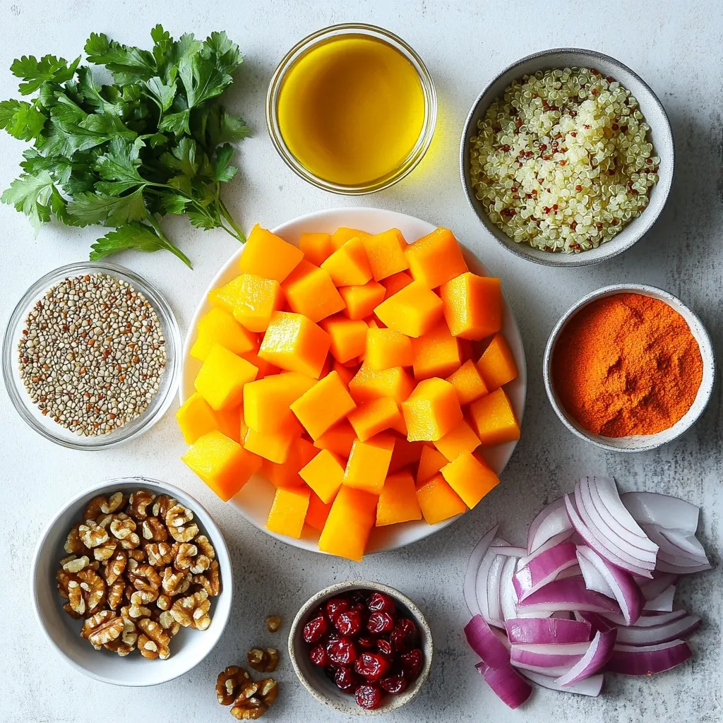 When I make this Roasted Butternut Squash Quinoa Salad, I start with the main ingredients. The butternut squash shines here. I peel and cube it into small pieces. This helps it roast evenly and caramelize nicely.