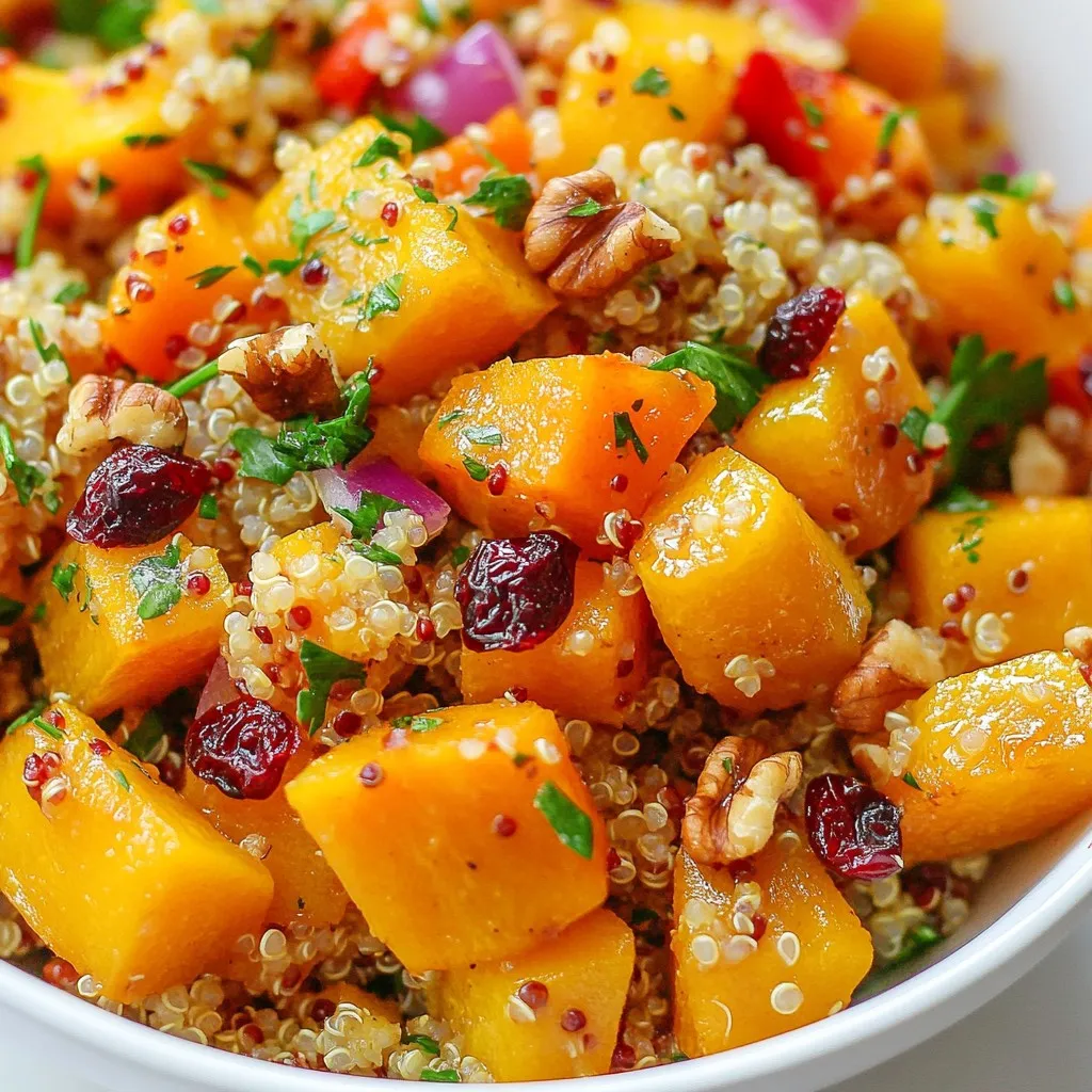 A delicious and nutritious salad featuring roasted butternut squash, quinoa, and a variety of colorful vegetables, perfect for any meal.