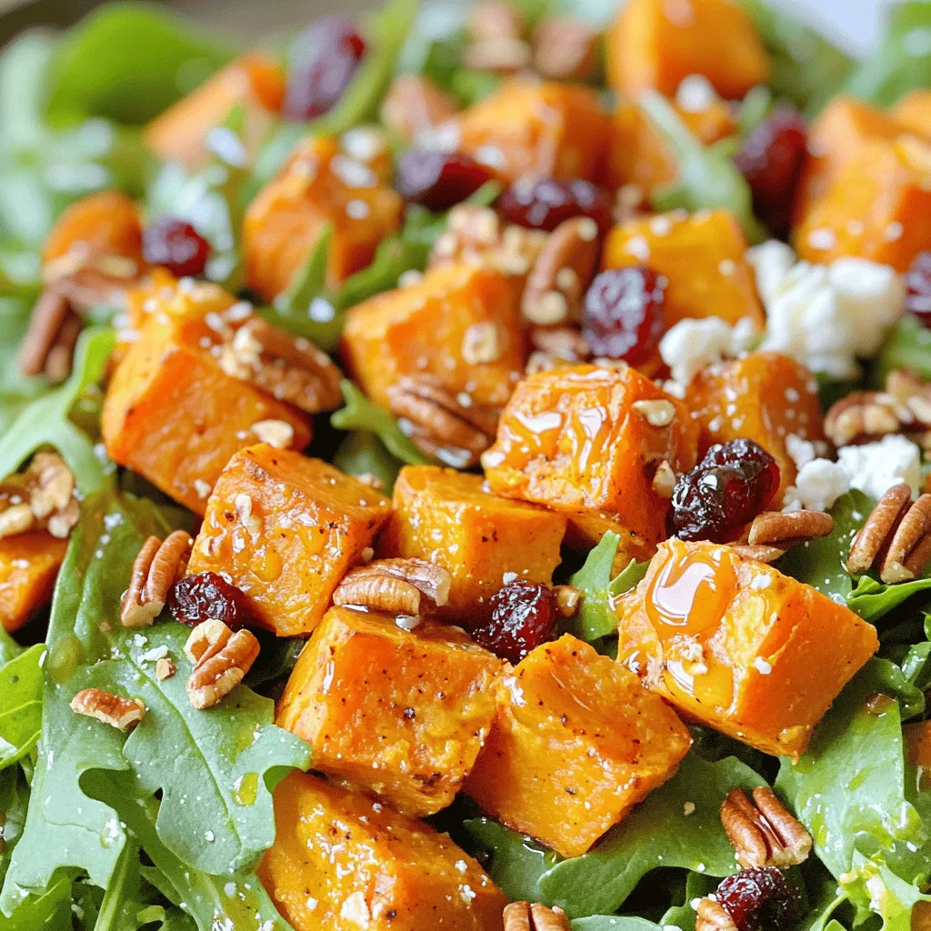 - 2 large sweet potatoes, peeled and diced - 3 cups mixed greens (arugula, spinach, and kale) - 1/2 cup pecans, roughly chopped - 2 tablespoons olive oil - 3 tablespoons maple syrup - 1 teaspoon cinnamon - 1/2 teaspoon salt - 1/4 teaspoon black pepper - 1/4 cup feta cheese, crumbled - 1/4 cup dried cranberries To make this roasted sweet potato salad, I focus on fresh, vibrant flavors. Sweet potatoes give the salad a warm, hearty base. I use mixed greens for a crisp texture. The pecans add a crunchy element that balances the softness of the sweet potatoes. When choosing sweet potatoes, look for firm ones with smooth skin. Their natural sweetness pairs perfectly with the maple syrup and cinnamon. The greens offer a mix of flavors, adding life to each bite. I often suggest using olive oil for roasting. It enhances the sweet potatoes and helps achieve a golden finish. The maple syrup adds a sweet touch, while cinnamon brings warmth. Don't forget the salt and pepper, as they elevate the overall flavor. For extra fun, consider the optional add-ins. Feta adds a creamy, salty bite. Dried cranberries give a pop of sweetness and color. You can find more details in the Full Recipe. This dish not only looks stunning but tastes amazing too! - Preheat oven to 425°F (220°C). - Toss sweet potatoes with olive oil, cinnamon, salt, and pepper. - Spread sweet potatoes on a baking sheet. Roast until tender and caramelized. Roasting sweet potatoes is the heart of this recipe. When you coat the diced sweet potatoes with olive oil and spices, you enhance their natural flavor. The cinnamon adds warmth, while the salt and pepper bring balance. Aim for a golden color on the edges. This caramelization makes each bite delightful. - Combine pecans with olive oil and maple syrup in a skillet. - Cook until toasted and caramelized. The pecans add a crunchy twist to the salad. When you mix them with olive oil and maple syrup, they become sweet and nutty. Cooking them over medium heat helps release their oils. Stir often to prevent burning. Once they turn golden brown, take them off the heat. This step is key to getting that perfect crunch. - Layer mixed greens in a serving bowl. - Add roasted sweet potatoes and top with pecans, cranberries, and feta. Now comes the fun part: assembling the salad! Start with a generous layer of mixed greens. I love using arugula, spinach, and kale for a vibrant mix. Then, add the roasted sweet potatoes. Their warmth will slightly wilt the greens, making them perfect. Finally, sprinkle the crunchy pecans, dried cranberries, and feta cheese on top. This creates a colorful and tasty dish. For the full recipe, check out the complete guide. To get sweet potatoes just right, I recommend using parchment paper. It makes cleanup a breeze. Also, flip your sweet potatoes halfway through roasting. This helps them caramelize evenly and adds a lovely flavor. Before serving, I like to drizzle extra maple syrup or olive oil over the salad. This adds a nice touch of sweetness. You can also brighten the dish by adding citrus juice or zest. Lemon or orange works well for this! Serving your salad can be fun! You might try a large platter for family meals. For individual servings, use small bowls. To make it pretty, garnish with whole pecans and cranberries. These little touches make your salad look as good as it tastes! {{image_2}} You can make this salad more filling by adding protein. Grilled chicken works great for meat lovers. It adds flavor and makes the dish hearty. If you want a plant-based option, try chickpeas. They add texture and protein without meat. For a heartier salad, consider quinoa or farro. Both grains have a nutty taste and boost nutrition. They also pair well with sweet potatoes and greens. Switching up the greens can change the whole salad. You can use kale or romaine instead of mixed greens. Both have a nice crunch and hold up well to dressings. If you want a spicy twist, try arugula. It adds a peppery kick that complements the sweetness of the potatoes. Mixing greens can create a fun, tasty salad that keeps things interesting. The dressing can really make or break this salad. While maple syrup adds sweetness, you can experiment with balsamic vinaigrette. It adds a tangy flavor that balances the sweet potatoes. Another option is a yogurt-based dressing. This adds creaminess and a rich taste. Feel free to mix and match dressings to find your favorite blend. Each choice can change the whole vibe of the dish. For detailed cooking steps, refer to the Full Recipe. Store leftover salad in an airtight container. This keeps it fresh for later. If you want to maintain crispness, keep the dressing separate. This prevents the greens from wilting and losing their vibrant look. When ready to eat, simply drizzle on the dressing. You can freeze sweet potatoes before roasting them. Just dice and place them in a freezer bag. When you are ready to use them, roast them from frozen or thaw them first. Pecans can also be stored for longer shelf life. Keep them in a cool, dry place or freeze them for fresh flavor. Reheat sweet potatoes in the oven for the best texture. This will keep them crispy outside and soft inside. If you like it cool, serve the salad chilled. This makes for a light and refreshing summertime dish. Yes, you can prepare components separately and assemble before serving. This makes it easy for a busy weeknight or a gathering. Yes, all ingredients are naturally gluten-free. This means everyone can enjoy it without worry. Omit feta cheese and use a plant-based dressing. This keeps the flavors fresh and vibrant while meeting vegan needs. This salad brings together the sweet taste of roasted sweet potatoes, crunchy pecans, and healthy greens. Following the tips and tricks, you can make it perfect. Remember, you can add protein or different greens for a personal touch. You can even store leftovers for later meals. This dish is flexible, tasty, and good for you! Enjoy each bite knowing it's no