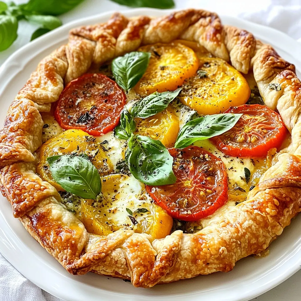 A delicious and rustic galette filled with fresh tomatoes, basil, and cheese, perfect for a light meal or appetizer.