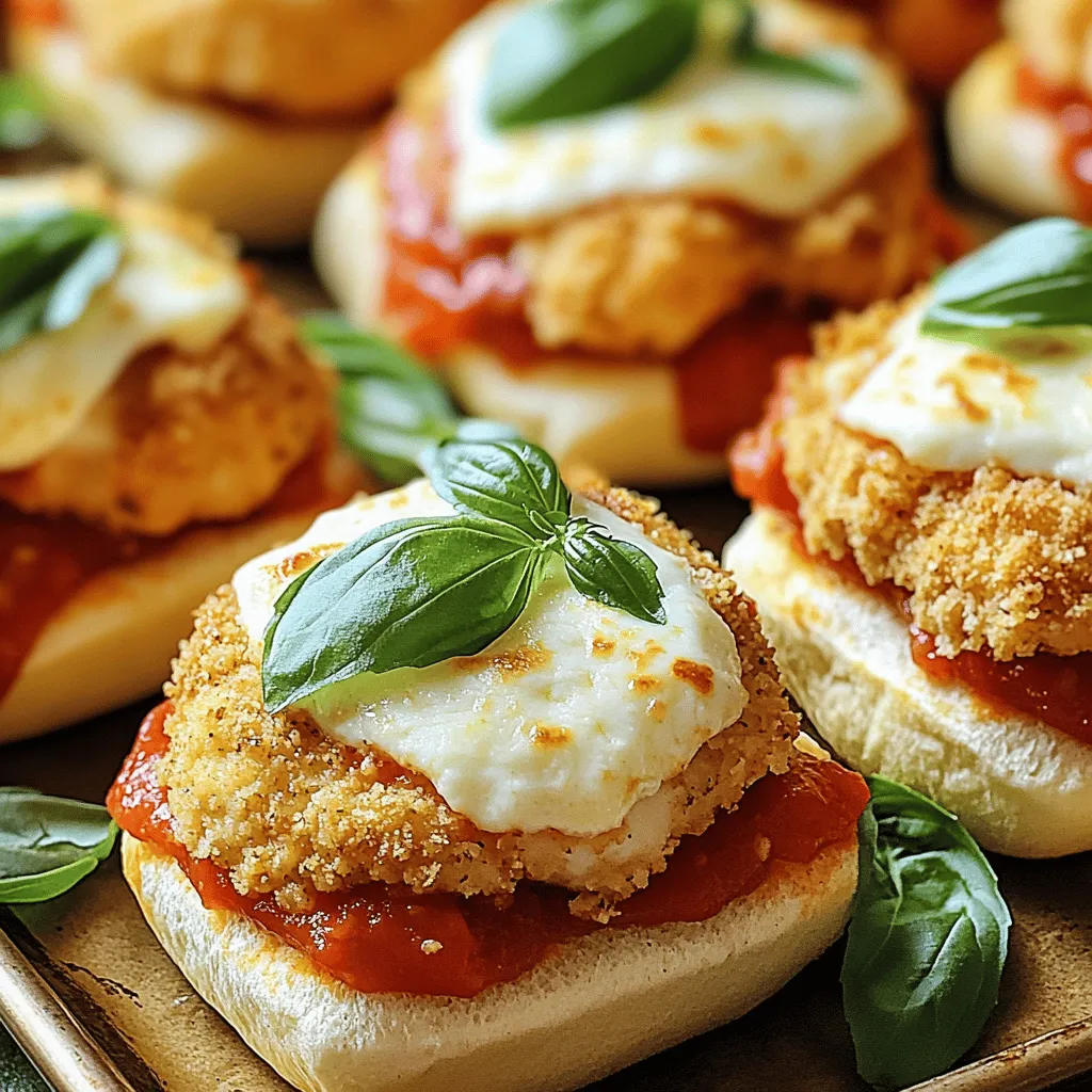 ![- 1 lb boneless, skinless chicken breasts - 1 cup breadcrumbs (Italian seasoned) - 1/2 cup grated Parmesan cheese - 1 teaspoon garlic powder - 1 teaspoon dried oregano - 1/2 teaspoon salt - 1/4 teaspoon black pepper - 2 large eggs - 1 cup marinara sauce - 1 1/2 cups shredded mozzarella cheese - 12 slider buns - Fresh basil leaves for garnish - Olive oil for frying This dish starts with fresh chicken. I prefer boneless, skinless chicken breasts for easy slicing. You will need breadcrumbs for a crispy coating. Italian-seasoned breadcrumbs add flavor. Grated Parmesan cheese gives a rich taste. Garlic powder and dried oregano boost the dish's aroma. Salt and black pepper bring out the flavors. Eggs help the breadcrumbs stick to the chicken. Marinara sauce adds moisture and taste to the sliders. Shredded mozzarella cheese melts beautifully on top. Slider buns hold everything together. Fresh basil leaves add a nice touch. Use olive oil for frying to achieve a golden crust. Each ingredient plays a key role in creating tasty Chicken Parmesan Sliders. You can find the full recipe for step-by-step guidance. - Caloric content per slider: Around 250 calories - Macronutrients breakdown: - Proteins: 18g - Fats: 12g - Carbohydrates: 20g - Dietary considerations: Gluten-free breadcrumbs are available. You can make low-carb options using zucchini slices instead of buns. This information helps you make informed choices about your meal. Enjoy these sliders without worry about your diet! First, preheat your oven to 375°F (190°C). This heat ensures your sliders bake evenly. Next, grab a baking sheet and lightly grease it with cooking spray or olive oil. This prevents sticking and helps with easy cleanup. Now, let’s prepare the chicken. Take the boneless, skinless chicken breasts and slice them in half horizontally. This makes thinner cutlets that fit perfectly in the slider buns. Next, for the coating, mix breadcrumbs, grated Parmesan cheese, garlic powder, oregano, salt, and pepper in a bowl. This blend adds flavor and crunch. In another bowl, beat the two large eggs. Take each chicken cutlet and dip it first in the eggs. After that, coat it in the breadcrumb mix. Make sure each piece is fully covered for that crispy texture. In a large skillet, heat olive oil over medium-high heat. Once hot, add the coated chicken cutlets. Fry them for about 3-4 minutes on each side until they turn golden brown and are cooked through. After frying, place them on the prepared baking sheet. Now comes the fun part! Spoon marinara sauce over each fried chicken piece. Then, top each with shredded mozzarella cheese. This creates a melty topping that’s hard to resist. Bake the chicken for about 10 minutes, or until the cheese is bubbly and golden. While the chicken bakes, lightly toast the slider buns in the same skillet. This adds a nice crunch. Finally, assemble your sliders! Place each chicken cutlet on the bottom half of a toasted slider bun. Add a few fresh basil leaves for extra flavor before topping it with the other half. Enjoy your tasty Chicken Parmesan Sliders! For the full recipe, check out the provided instructions. To make great sliders, you need to fry the chicken at the right temperature. Aim for about 350°F (175°C). This temperature helps the chicken cook evenly and stay juicy. If the oil is too hot, the outside burns, but the inside stays raw. To avoid soggy buns, toast them lightly in the skillet. This step creates a barrier that keeps moisture from the chicken and sauce. You can also use sturdy slider buns, which hold up better against the toppings. To boost the flavor, try adding spices. A pinch of paprika or a little cayenne can add warmth. Fresh herbs like thyme or rosemary can also make a big difference. Mix these herbs into the breadcrumb coating for extra flavor with each bite. You can customize your marinara sauce too. Add sautéed onions or bell peppers for a sweet touch. A dash of red pepper flakes gives it a nice kick. If you prefer creamy sauce, mix in a little heavy cream for a rich taste. For sides, consider a crisp salad or some roasted veggies. A light side balances the richness of the sliders. You could also serve sweet potato fries for a tasty twist. When it comes to drinks, pair your sliders with a light beer or a crisp white wine. Sparkling water with lemon is a refreshing non-alcoholic option. These choices help cut through the cheese and sauce, making every bite enjoyable. For the full recipe, check [Full Recipe]. {{image_2}} You can switch up the main protein. Use turkey instead of chicken for a leaner option. Tofu works great too if you want a vegetarian meal. Both options taste delicious and are easy to prepare. For those who need gluten-free options, try using gluten-free breadcrumbs. They provide the same crispy texture without the gluten. Want to spice things up? Make spicy Chicken Parmesan sliders by adding red pepper flakes to the breadcrumb mix. This gives a nice kick! Another fun idea is to create a Caprese-inspired slider. Just add fresh tomatoes and pesto to your chicken. This adds a fresh and vibrant twist to the classic flavors. If you're hosting a party, consider making mini sliders. They are perfect as appetizers and easy for guests to grab. Alternatively, you can use larger buns for a full sandwich. This makes a heartier meal if you're feeling extra hungry. Either way, these variations keep your Chicken Parmesan sliders fresh and exciting! To keep your Chicken Parmesan Sliders fresh, store any leftovers in the fridge. Place them in an airtight container. This helps keep moisture in and prevents them from drying out. You can also wrap them tightly in plastic wrap. Make sure to eat them within three days for the best taste. If you want to save sliders for later, freezing is a great option. First, let the cooked sliders cool completely. Then, wrap each one in foil or plastic wrap. Place them in a freezer-safe bag or container. This way, they can stay fresh for up to
