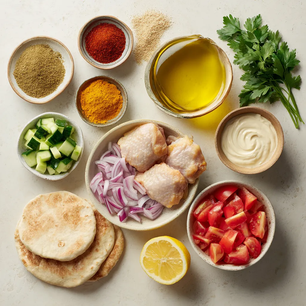 Gather these ingredients, and you are ready to make delicious chicken shawarma pita wraps!