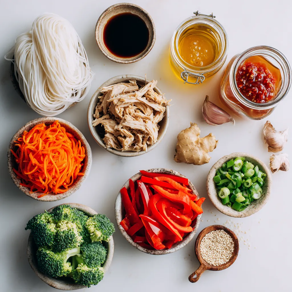 To make Sesame Peanut Chicken Noodles, you need fresh and bright ingredients. First, grab 8 oz of rice noodles. They will be the base for your dish. Next, choose 1 lb of boneless chicken thighs. These thighs add rich flavor and juicy texture.