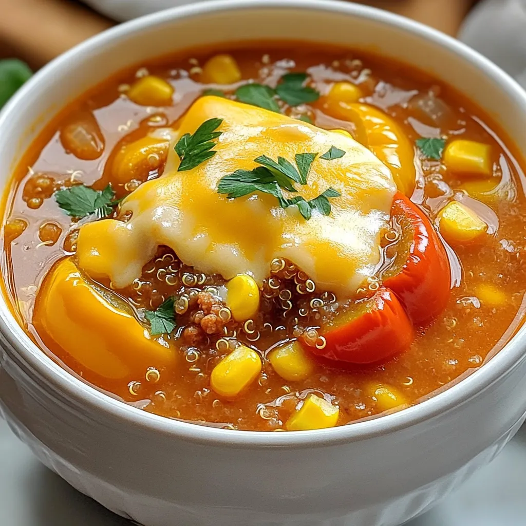 For this savory stuffed pepper soup, gather these key ingredients: - 4 large bell peppers (any color), diced - 1 lb ground turkey (or beef, if preferred) - 1 medium onion, chopped - 3 cloves garlic, minced - 1 (15 oz) can diced tomatoes, undrained - 4 cups beef or vegetable broth - 1 cup uncooked quinoa or rice - 2 teaspoons Italian seasoning - 1 teaspoon smoked paprika - 1 teaspoon salt - ½ teaspoon black pepper - 1 cup frozen corn - 1 cup shredded cheese (cheddar or mozzarella), for topping - Fresh parsley or cilantro, for garnish You can swap some ingredients to fit your taste. If you want a meatless dish, use lentils or beans instead of turkey. For a spicy kick, add diced jalapeños or some crushed red pepper. You can also replace quinoa with brown rice or even cauliflower rice for a low-carb option. If you don’t have Italian seasoning, use oregano, basil, or a mix of your favorite herbs. When selecting bell peppers, look for ones that feel heavy for their size. Their skin should be smooth and shiny. Avoid any with soft spots or wrinkles. Each color has a distinct taste; green peppers are more bitter, while red, yellow, and orange peppers are sweeter. Choose based on your flavor preference. If you like a little spice, try a poblano or Anaheim pepper for a different twist! Start with a skillet on medium heat. Add your ground turkey or beef. Brown the meat well. Use a spoon to break it up while it cooks. This should take about 5-7 minutes. If you see extra fat, drain it off. Next, toss in the chopped onion and minced garlic. Cook this mix for 3-4 minutes. You want the onion to become soft and clear. Now, move this mixture to your slow cooker. Add the diced bell peppers, undrained diced tomatoes, and broth. Include the uncooked quinoa or rice too. Don’t forget the Italian seasoning, smoked paprika, salt, and black pepper. Stir everything well to mix. Cover the slow cooker and set it to low. Cook for 6-8 hours or on high for 3-4 hours. The soup is ready when the quinoa or rice is soft and the peppers are tender. To brown meat right, heat the skillet before adding it. If it’s too cool, the meat will steam. Spread the meat evenly in the pan. This helps it cook faster. Avoid stirring too much at first. Let it sit for a minute to get a nice brown color. Then, break it up gently with your spoon. This gives you a better texture in the soup. Timing is key in slow cooking. If you want a quick meal, use the high setting. It cooks in 3-4 hours. For a richer flavor, go low and slow for 6-8 hours. This lets the ingredients blend well. Check the soup near the end. If the quinoa or rice is not soft, give it more time. In the last 15 minutes, add frozen corn. This keeps it bright and fresh. Enjoy the warm, hearty flavors when it’s ready! To boost the flavor of your soup, add more spices. Fresh herbs like basil or oregano work great. You can also squeeze in some lemon juice for a bright taste. A splash of hot sauce can wake up the flavors too. Try adding a bay leaf while it cooks. Remember to remove it before serving! Freezing this soup is easy. Let it cool completely before putting it in a container. Use airtight bags or freezer-safe containers. This keeps the soup fresh and tasty. Label the containers with the date. It should last about three months in the freezer. When ready to eat, thaw it in the fridge overnight. Heat it gently on the stove or in the microwave. You can change the spice level to match your taste. For mild soup, reduce the smoked paprika. If you like heat, add chili flakes or diced jalapeños. Taste the soup before serving. This way, you can adjust the spices for the perfect kick. Cooking is all about making it yours! {{image_2}} You can easily swap the ground turkey for other proteins. Ground beef works well if you want a richer flavor. If you prefer a lighter option, try ground chicken or turkey. For a fun twist, use chorizo for a spicy kick. These swaps let you customize the soup to your taste. To make this soup vegetarian, skip the meat and add more veggies. Use a mix of mushrooms, lentils, or beans for protein. You can also replace the broth with vegetable broth. For a vegan option, skip the cheese or use a plant-based cheese. This way, everyone can enjoy a delicious bowl. Feel free to add other veggies to the mix. Zucchini, carrots, or diced tomatoes work great. You can also toss in some spinach or kale for extra nutrients. Just remember, keep the balance so the flavors shine through. This soup is all about using what you have on hand. Let your creativity lead your choices! After enjoying your delicious slow cooker stuffed pepper soup, store any leftovers properly. Allow the soup to cool to room temperature. Then, transfer it into airtight containers. Make sure to leave some space at the top of the container. This space allows the soup to expand when frozen. You can also use freezer bags for easy storage. Just squeeze out the air before sealing. In the refrigerator, your soup will stay good for about 3 to 4 days. Ensure your fridge is at the right temperature, which is below 40°F (4°C). After this time, you might notice a change in taste or texture, so it's best to enjoy it within this timeframe. Reheat your soup on the stove for the best flavor. Pour the desired amount into a pot and heat over medium heat. Stir it often to ensure even warming. If you're in a hurry, you can use the microwave. Place the soup in a microwave-safe bowl and cover it. Heat in short bursts, stirring in between. This method warms the soup evenly and prevents hot spots. Enjoy your soup just as you did the first time! Yes! You can use barley or farro instead. These grains add a nice texture. Just adjust the cooking time as needed. Make sure to check if they require more liquid or longer cooking. To make this soup gluten-free, choose gluten-free broth. Also, use quinoa or rice, as both are gluten-free. Always check labels to ensure no hidden gluten in canned goods or spices. Toppings can really