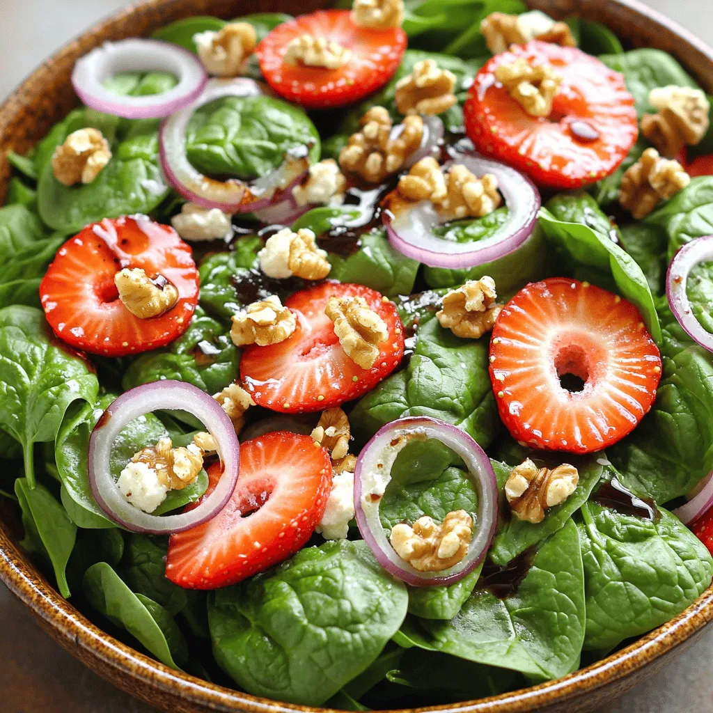 - Fresh spinach leaves - Fresh strawberries - Crumbled goat cheese - Walnuts - Red onion - Balsamic vinegar - Olive oil - Honey - Salt and pepper When you make a Strawberry Spinach Goat Cheese Salad, the ingredients matter a lot. Fresh spinach leaves form a vibrant base. They add a nice crunch and a healthy touch. Then, you need fresh strawberries. These sweet gems balance the salad with their juice and color. You also want crumbled goat cheese. Its creaminess adds depth and richness to every bite. Next, you will need some items from your pantry. Walnuts give a lovely crunch. Toast them for added flavor. A red onion adds a sharp bite, which contrasts the sweet strawberries. Balsamic vinegar brings a tangy note that pulls everything together. The dressing is simple yet delicious. Combine olive oil and honey for a sweet and savory mix. Salt and pepper enhance the flavors. This dressing coats the salad perfectly and makes it shine. For the full recipe and detailed instructions, check out the Full Recipe section. Enjoy making this delightful salad! First, wash and dry your fresh spinach leaves. Make sure they are clean. Next, rinse your strawberries. Hull and slice them into thin pieces. This step is simple but key to good flavor. Now, toast your walnuts. Heat them in a pan over medium heat. Stir them often until they are golden and fragrant. This brings out their nutty taste. Now it’s time to mix your salad. In a large bowl, combine the fresh spinach and sliced strawberries. Make sure to mix them well. Next, sprinkle in the crumbled goat cheese. Then, add the toasted walnuts. Don’t forget to toss in the thinly sliced red onion for some crunch. This creates a lovely blend of colors and textures. For the dressing, grab a small jar or bowl. Whisk together balsamic vinegar, olive oil, honey, salt, and pepper. Mix until it is well combined. This dressing adds a sweet and tangy flavor. Drizzle it over your salad mix. Toss everything gently so the goat cheese stays intact. Taste the salad and adjust the seasoning if needed. Serve immediately to enjoy the fresh flavors. For the complete instructions, check out the Full Recipe. To make your salad shine, you need ripe strawberries. Look for berries that are bright red and firm. Avoid any that have bruises or mold. Ripe strawberries taste sweet and juicy, enhancing the salad's flavor. When it comes to goat cheese, crumbling it can be tricky. Use your fingers to gently break it apart. If it sticks to your hands, wet them slightly. This helps keep the cheese from clumping together. You want nice, fluffy pieces that mix well with the greens. You can change up the dressing for a new twist. Try using lemon juice or yogurt instead of balsamic vinegar. Each adds a fresh taste. If you like it sweeter, add more honey. Just remember to balance the flavors so it isn’t too sweet. Serve the salad in large bowls for family-style dining. For a more elegant touch, use small plates. This makes the dish look fancy. You can also pair it with grilled chicken or fish. Adding slices of avocado gives a creamy texture. {{image_2}} You can change up the cheese if you want. Feta cheese adds a nice salty bite. Blue cheese gives a strong flavor that many love. Try these options to find your favorite. For nuts, walnuts work well, but you can swap them out too. Almonds or pecans add a different crunch. Just toast them for extra flavor. Seasonal fruits can boost your salad. In summer, add juicy peaches or nectarines. Their sweetness pairs well with spinach and cheese. You can also toss in berries like raspberries or blackberries for added taste. Fresh herbs can liven up your salad too. Basil or mint can add a fresh twist. Just chop them finely and mix them in. They bring a new flavor that brightens the dish. This salad can fit many diets. For gluten-free needs, it’s already safe. Just skip any croutons if you decide to add them. If you want a vegan version, swap out the goat cheese. Use avocado or a dairy-free cheese instead. A sprinkle of nutritional yeast can add a cheesy flavor. This way, everyone can enjoy this tasty salad. For the Full Recipe, check the main section above. To keep your salad fresh, store leftovers in an airtight container. This helps seal in flavor. Place the salad in the fridge as soon as you finish eating. Use glass or plastic containers that fit well. Avoid using large bowls, as excess air can make it go bad faster. Can you freeze this salad? No, freezing is not ideal for this dish. Fresh ingredients like spinach and strawberries do not hold up well when frozen. They lose texture and flavor. Instead, make only what you can eat. For best results, prepare the salad fresh each time. Best practices for refreshing the salad include adding new ingredients. If the salad sits too long, it may wilt. Try adding fresh spinach and strawberries to perk it up. You can also drizzle a bit of dressing on top. This keeps the flavors bright. Enjoy your salad fresh for the best taste. For the full recipe, check the link above. This salad lasts about three days in the fridge. Store it in an airtight container. Keep in mind that the spinach can wilt over time. For the best taste, eat it fresh. Yes, you can prep some parts ahead. Wash and slice strawberries and store them separately. You can also chop nuts and make the dressing in advance. Just wait to mix it until you are ready to eat. This keeps everything fresh and crisp. This salad pairs well with grilled chicken or fish. You can also serve it with crusty bread for a light meal. Consider adding a side of fruit for extra flavor and color. For detailed instructions, check the [Full Recipe](#). In this post, we covered how to make a delicious Strawberry Spinach Goat Cheese Salad. We explored fresh ingredients and pantry essentials, plus how to mix and dress the salad. I shared tips for perfecting your dish and offered variations to fit your taste. This salad is simple, fresh, and satisfying. You can enjoy it any time of 