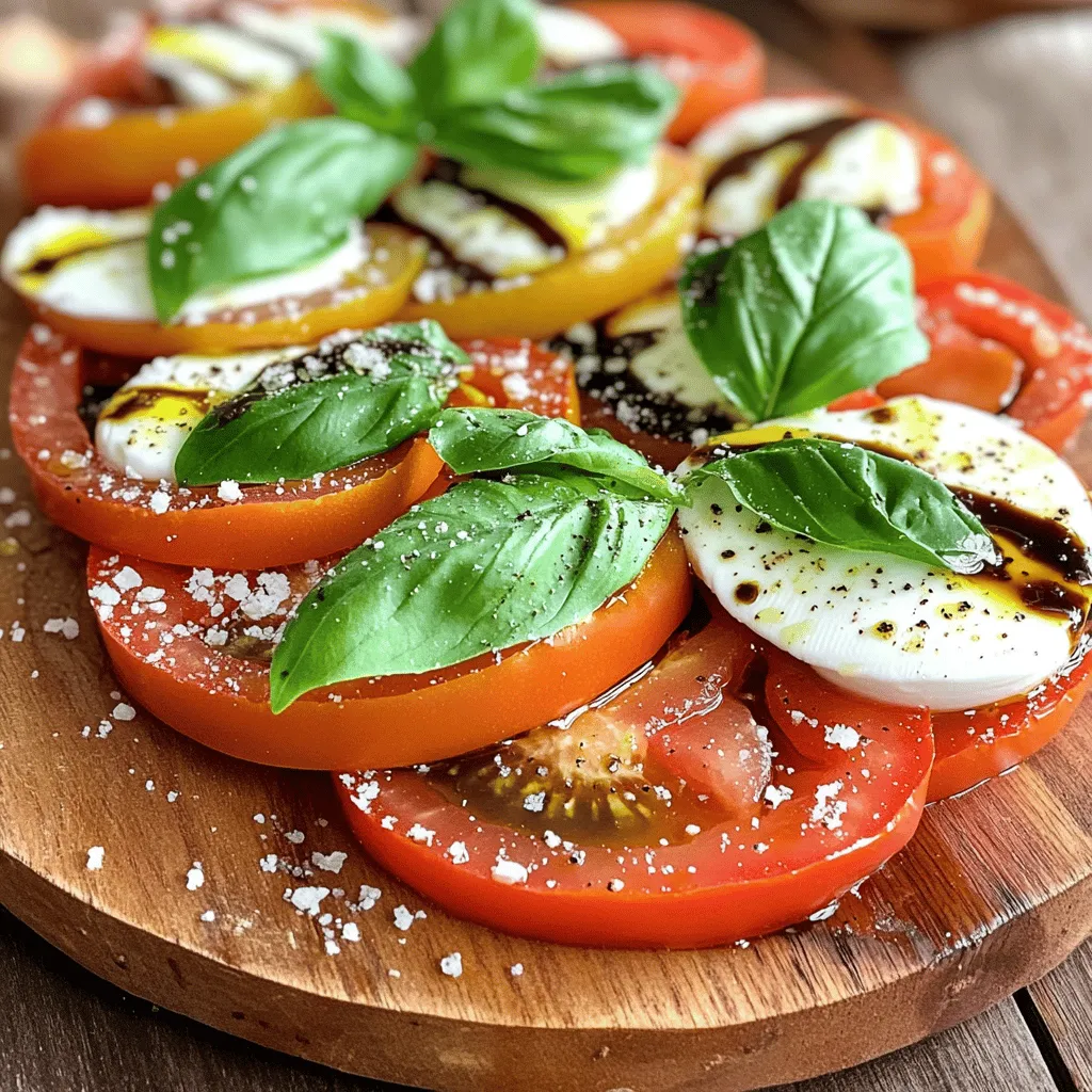 ![- 4 large ripe tomatoes, sliced - 8 oz fresh mozzarella, sliced - 1 cup fresh basil leaves - 3 tablespoons extra virgin olive oil - 1 tablespoon balsamic glaze - Salt and freshly cracked black pepper to taste - 1/4 teaspoon red pepper flakes (optional) For this Tomato Basil Mozzarella Salad, freshness is key. When you select your tomatoes, look for ones that are bright and firm. Ripe tomatoes bring a sweet, juicy flavor that makes this dish pop. Fresh mozzarella is creamy and light. It melts in your mouth, enhancing the salad's texture. Basil adds a fragrant note. Use fresh basil leaves for the best taste. When it comes to olive oil, extra virgin is a must. It brings depth and richness. Balsamic glaze adds a tangy sweetness that balances the flavors perfectly. Don’t forget the seasoning! Salt and pepper elevate every ingredient. If you like a little heat, add red pepper flakes. They’re optional but tasty. This salad is simple yet bursting with flavor. You can find the full recipe above to get started! To start, I slice four large, ripe tomatoes. I make sure the slices are thick enough to hold up well. Next, I slice eight ounces of fresh mozzarella. This cheese adds a creamy touch. On a large serving platter, I arrange the tomato and mozzarella slices. I alternate the slices, slightly overlapping them for a nice look. After that, I tuck in fresh basil leaves between the slices. This adds a pop of color and a burst of flavor. Now, let's make the dressing. I take a small bowl and whisk together three tablespoons of extra virgin olive oil and one tablespoon of balsamic glaze. I add salt and freshly cracked black pepper to taste. If you like a bit of heat, I include a quarter teaspoon of red pepper flakes. This adds a nice kick to the salad. Once the dressing is ready, I drizzle it over the salad. I make sure to coat each slice with the dressing. This way, every bite is full of flavor. After drizzling, I let the salad sit for about five to ten minutes. This time allows the flavors to come together. The salad becomes even more delicious! For the full recipe, check out the details above. Choosing ripe tomatoes is key for flavor. Look for tomatoes that feel heavy for their size. They should have a bright color and a slight give when you press them. This ensures they are juicy and sweet. Fresh mozzarella is also important. It has a soft and creamy texture that makes the salad shine. Low-moisture mozzarella can work, but it lacks the freshness you want. Stick to fresh mozzarella for the best taste and texture. This salad makes a perfect side dish for summer meals. It pairs well with grilled meats like chicken or steak. The fresh flavors brighten up any plate. You can also serve it with crusty bread. This allows you to soak up the tasty dressing. It’s a simple way to elevate your meal. Enjoy the colors and flavors of summer with every bite! {{image_2}} You can easily change this salad up. Consider adding avocado for a creamy texture. It adds healthy fats and a nice bite. You can also use arugula. This peppery green brings a fun crunch and flavor. If you want a Mediterranean twist, stir in some olives. They add saltiness and depth. Sun-dried tomatoes can also work well. Their sweet and tangy profile pairs great with fresh tomatoes. Don't be afraid to play with your dressing. Different vinegars can change the taste. Try red wine vinegar for a bolder flavor. Apple cider vinegar adds a sweet touch. You might want to use herbs in your dressing too. Fresh oregano or thyme can elevate the dish. For a unique flavor, use pesto instead of oil and vinegar. It gives a rich taste and pairs well with the cheese and tomatoes. Explore these options to make this Tomato Basil Mozzarella Salad your own. For the full recipe, check out the details above! To keep your Tomato Basil Mozzarella Salad fresh, use airtight containers. Glass containers are great because they don’t retain odors. You can also use plastic containers with a tight lid. Make sure to store the salad in the fridge right after serving. This helps maintain its taste and texture. If you have leftover dressing, store it in a separate container. This keeps the salad from getting soggy. Before serving leftovers, shake the dressing well. This ensures all the flavors mix again. Your salad stays fresh in the refrigerator for about 2-3 days. After that, the tomatoes and basil may wilt. To revive wilted ingredients, try gently rinsing them with cold water. This can help bring back some crunch. If the salad looks a bit sad, you can add a splash of fresh olive oil. This adds moisture and flavor. Always check for off smells or signs of spoilage before eating leftovers. Enjoy your fresh and easy Tomato Basil Mozzarella Salad again! For the full recipe, check out the [Full Recipe]. Yes, you can make this salad ahead. It's best to prep it no more than 2 hours in advance. If you make it too early, the tomatoes can get soggy. To keep it fresh, store the salad without the dressing. Add the dressing just before serving. This keeps the flavors bright and the textures perfect. Fresh mozzarella is the best choice for this salad. It has a soft texture and rich flavor that pairs well with tomatoes. Regular mozzarella is firmer and dryer. It lacks the creaminess of fresh mozzarella. If you want a stronger taste, try burrata. It adds a lovely creaminess to the dish. To make this salad vegan, substitute the mozzarella with a plant-based cheese. Look for brands that mimic the taste of mozzarella. For the dressing, use a simple mix of olive oil and lemon juice. This will give a fresh flavor without dairy. You can also add a sprinkle of nutritional yeast for a cheesy flavor. This blog post covered the essentials for creating a fresh tomato basil mozzarella salad. You learned about the key ingredients, step-by-step instructions, and helpful tips. The variations and storage advice help you customize and keep your salad at its best. Remember, ripe tomatoes and fresh mozzarell